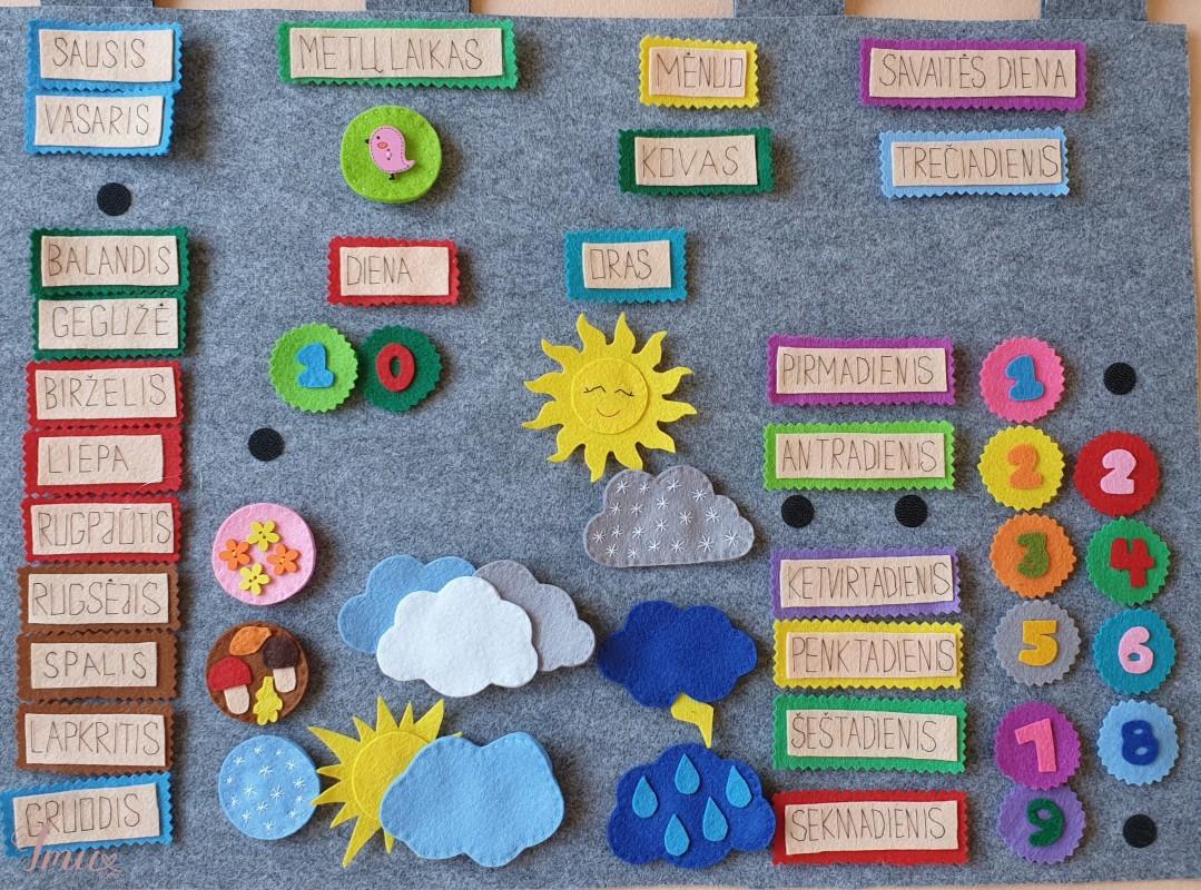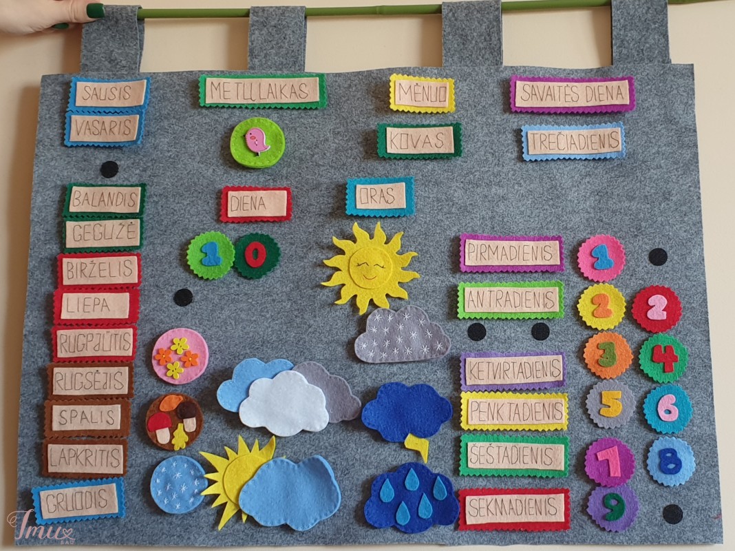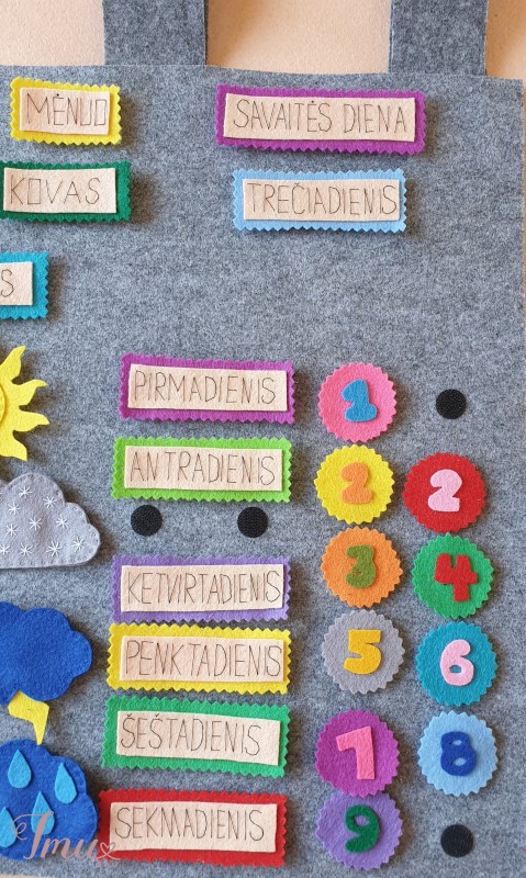 Plotis - 60cm, aukštis- 40cm. Padarytos kilpos į kurias galima įdėti pagaliuką ir pakabinti (kalendorius be pagaliuko). Visi elementai prisisega lipukais. Visi užrašai siuvinėti rankomis. Metų laikai, mėnesiai, savaitės dienos, diena, orai. Smagus, spalvotas kalendorius. Kiekvieną dieną keičiamas oras, savaitės diena, diena.