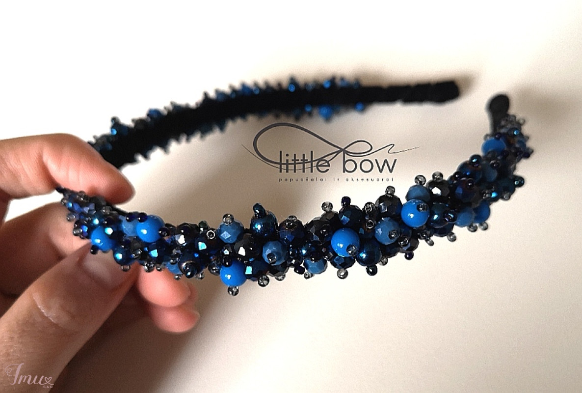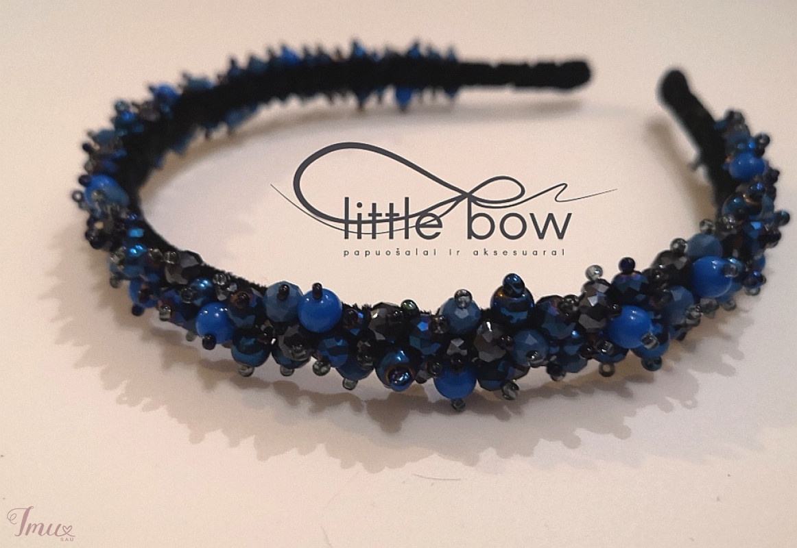 Naujas rankų darbo, karoliukais siuvinėtas lankelis ~1,5 cm pločio. Pagrindas metalinis (nelūžta), padengtas minkštu veliūro, dėl to nespaudžia galvos bei nekrenta, neslysta nuo plaukų. Puikiai tinka pasipuošti šventei, pritaikomas kasdieniame stiliuje.