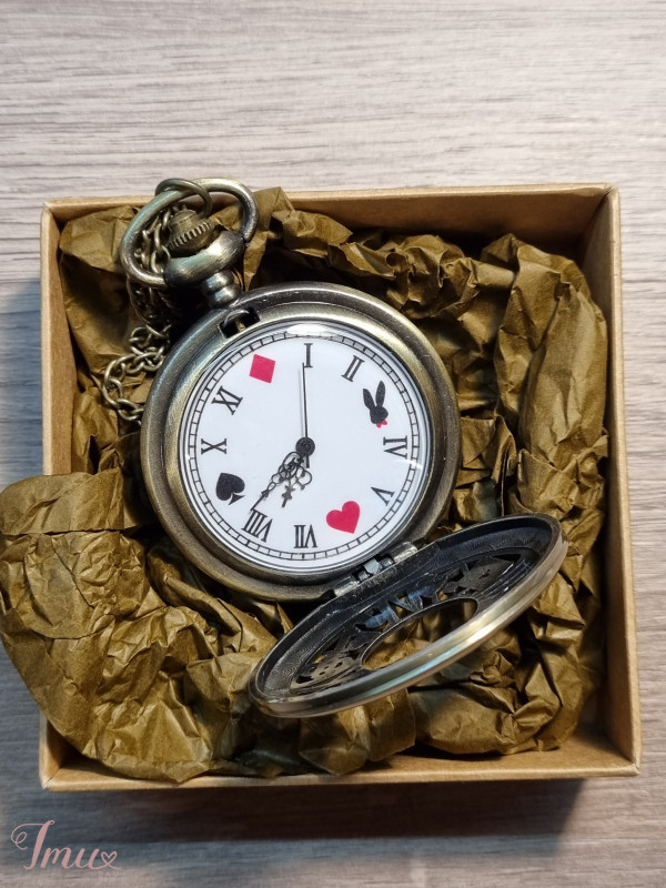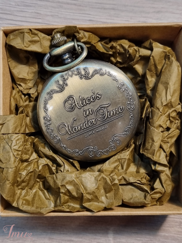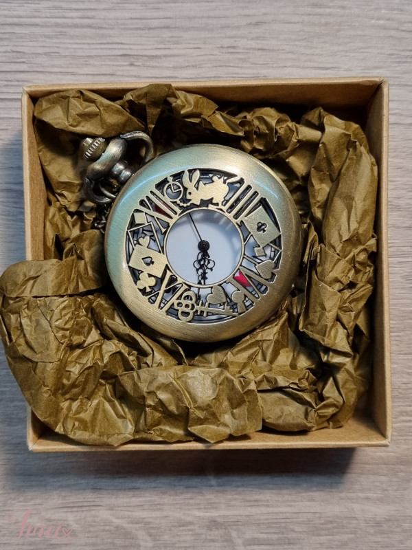 Visiškai naujas, nė karto nebuvo naudojamas, kišeninis laikrodukas, išpuoštas įvairiais fragmentais iš filmo ,,Alisa stebuklų šalyje". Patogus, turi grandinėlę.