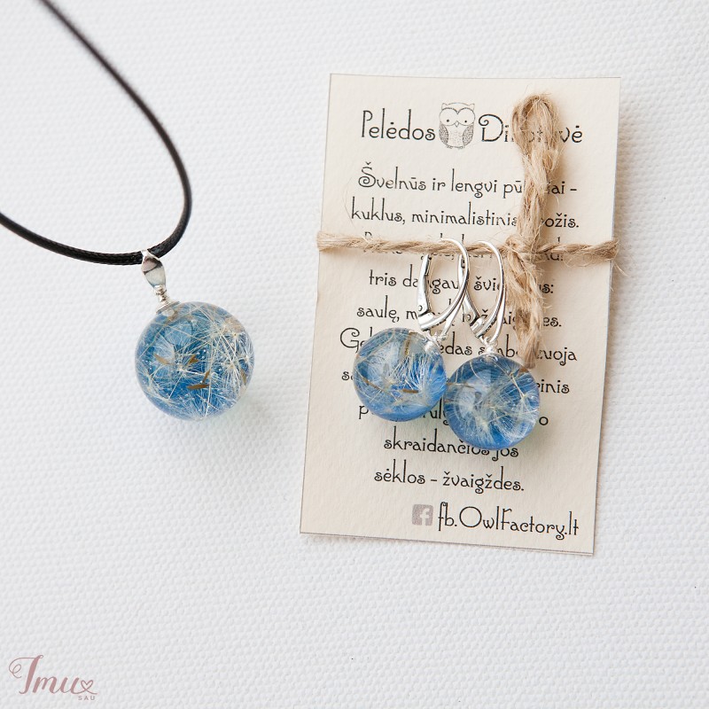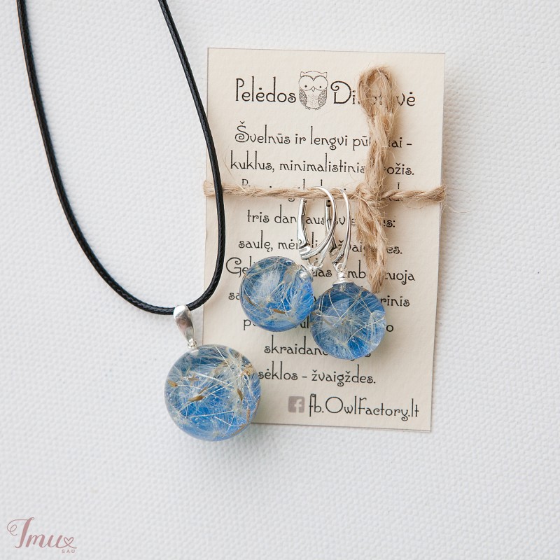 Komplektas su melsvu fonu ir natūraliais pienių pūkais Auskarai : užsegimai - sidabras, skersmuo ~15mm; Pakabukas: laikiklis sidabras, skersmuo ~25mm; Papuošalai su tikrais augalais ir aukštos kokybės juvelyrine derva, lengvi, nedūžta. *Perkant atskirai brangiau, komplektams taikau nuolaidas: Auskarai - 20€; Pakabukas - 16€