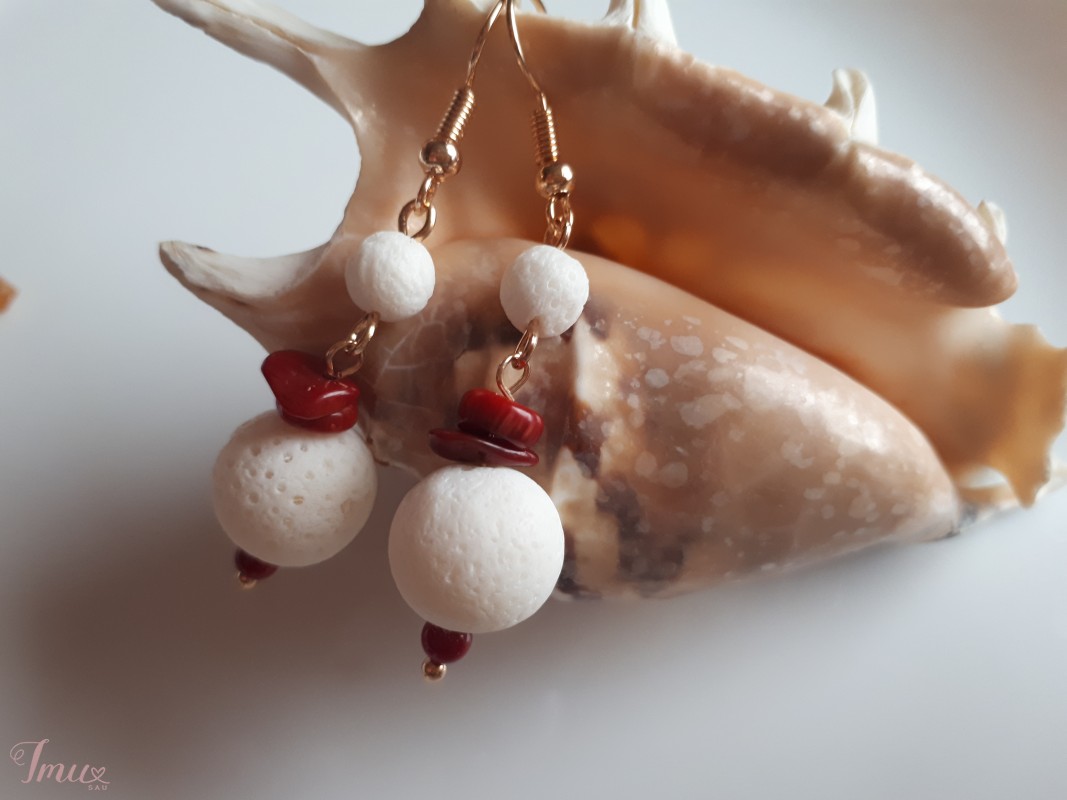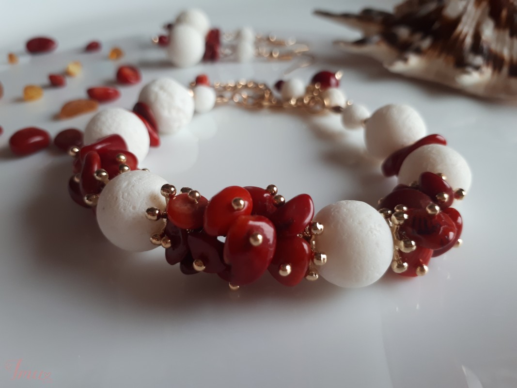 Apyrankės ir auskarų komplektas, raudonas ir baltas koralai, aukso spalvos detalės. Auskarų ilgis apie 3 cm. Siuntimas reg. paštu 1,6 eur, paštomatu 2 eur