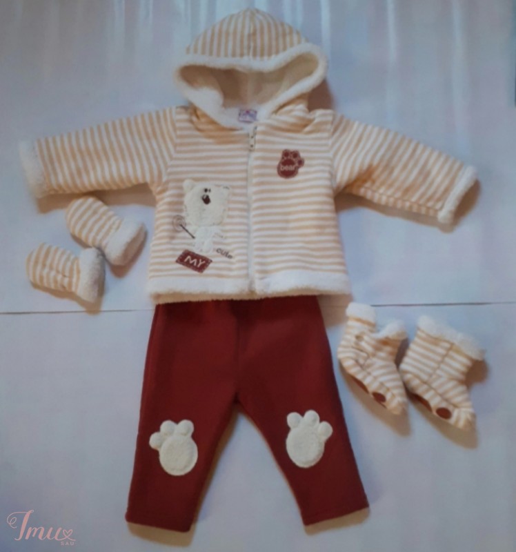 Šiltas kostiumėlis komplektukas iš keturių dalių : megztukas su kapišonu, kelnytės su pūkeliu, pirštinytės ir tapukai. Ukrainiečių Flamingo firmos, kokybiški ir gražūs rūbeliai, naujo kaina virš 20eurų. Dėvėtas mažai. Dydis nurodytas 68. Išmatavimai : Megztuko ilgis nuo peties 28cm, nuo pažastuko iki pažastuko užsegto 27cm, rankovė nuo pažastuko 18cm. Kelnyčių ilgis 36cm, nuo klyniuko 19cm, liemuo netempiant 18,5cm tempiasi iki 25cm. Labai mielas ir gražus, išskalbtas, bet būklė puiki. Tinka tiek mergaitei, tiek berniukui. Kaina 7eurai