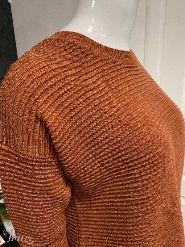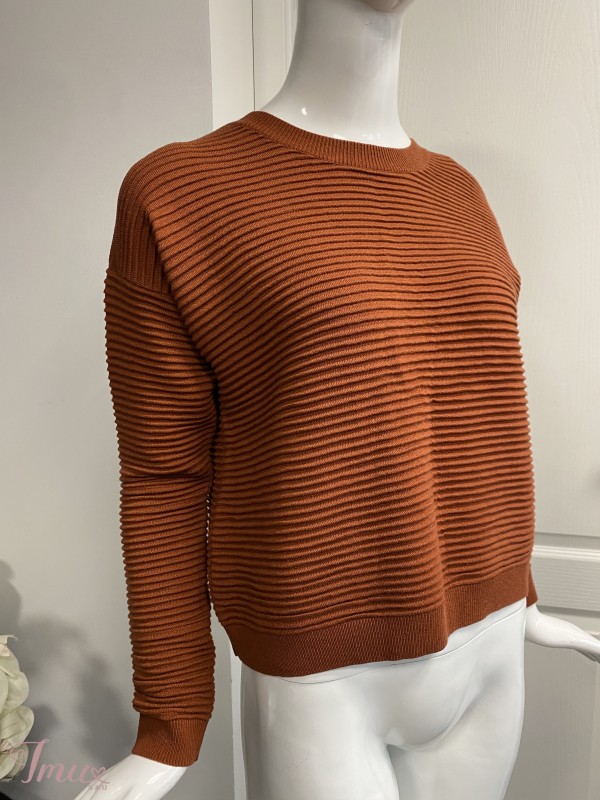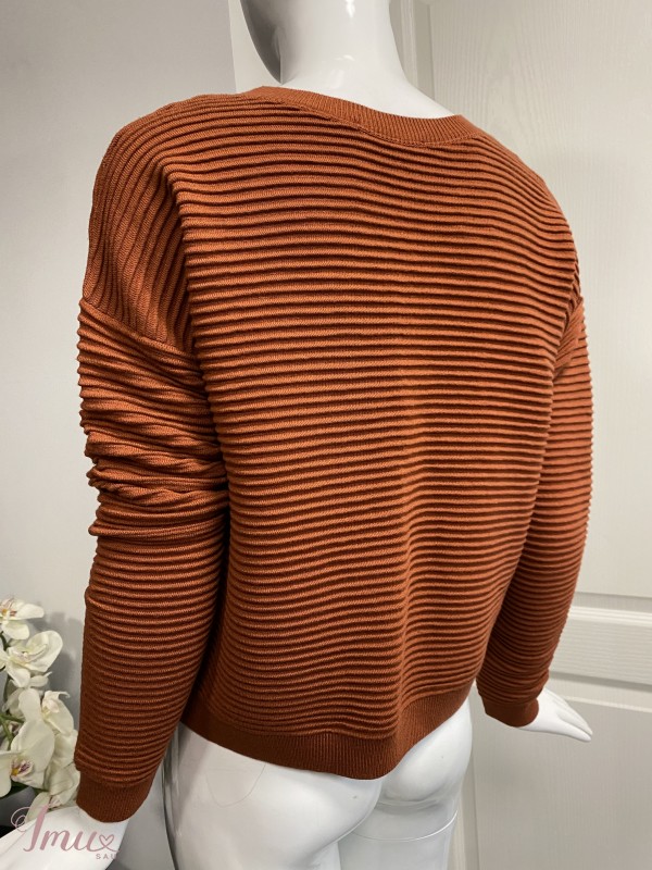 KONTATTO rudas megztinis, dydis universalus, išmatavimai: ilgis 49 cm, krūtinė 104 cm, rankovių ilgis 46 cm.