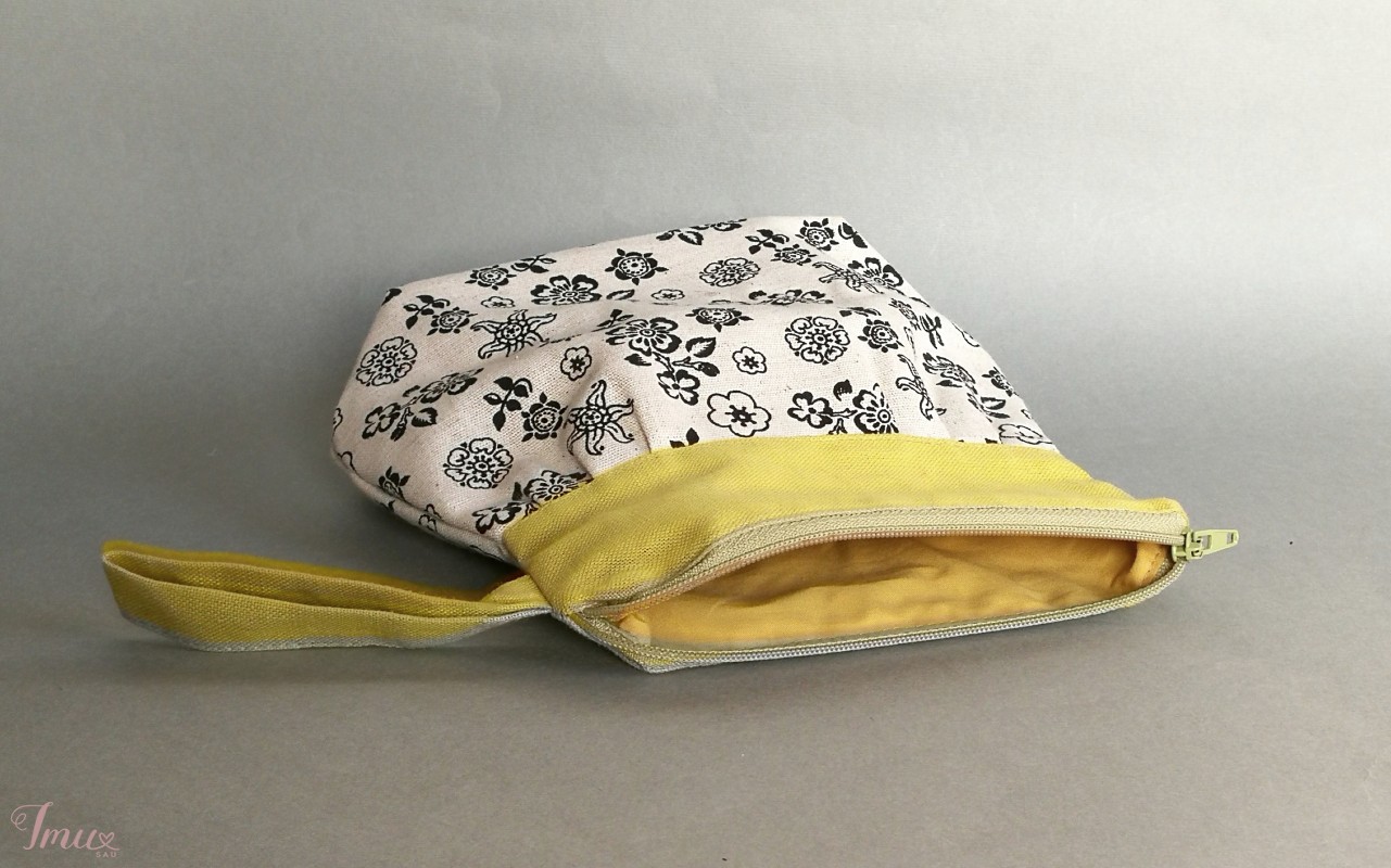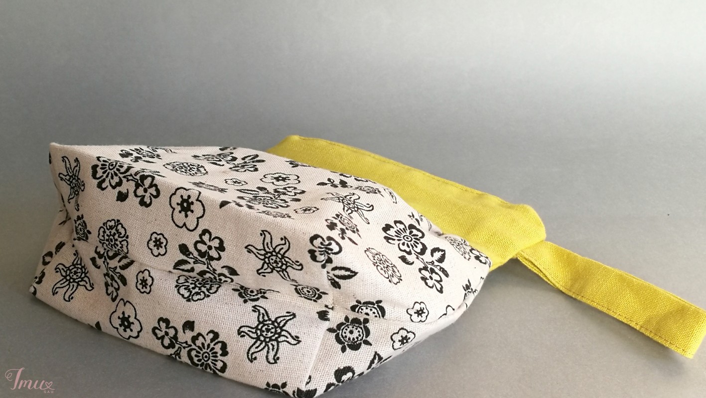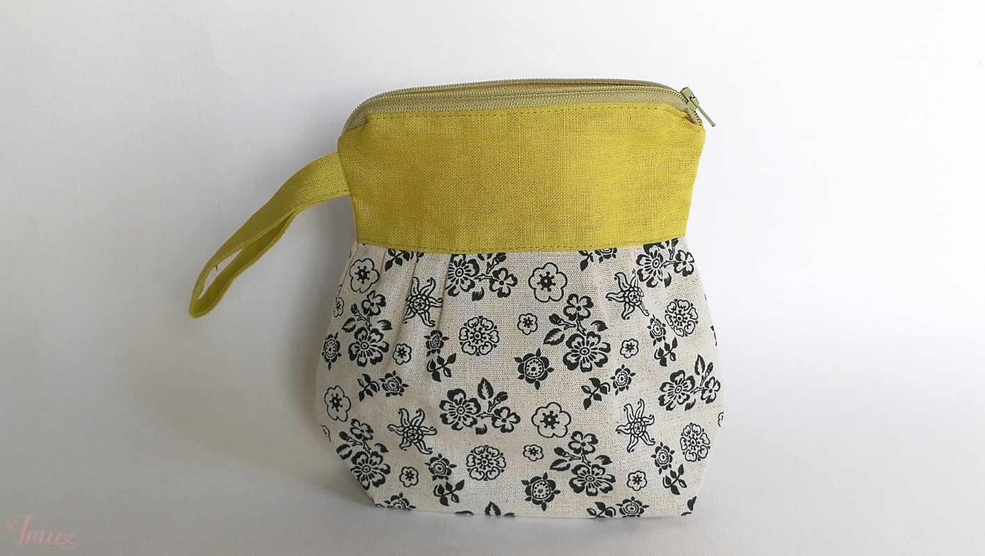 Maža kosmetinė "Gėlėta" pasiūta iš geltono 100% lino, gėlėto (52% linas, 48% medvilnė) audinio. Pamušalas 100% medvilnė. Išmatavimai: aukštis: 18,5 cm geltonos dalies plotis: 16 cm gėlėtos dalies plotis: 20 cm dirželis: 8,5 cm dugnas: 7 cm Priežiūra: Skalbti rankomis arba skalbimo mašinoje apie 40C. Nebalinti. Nedžiovinti saulėje..Lyginti dar drėgną.