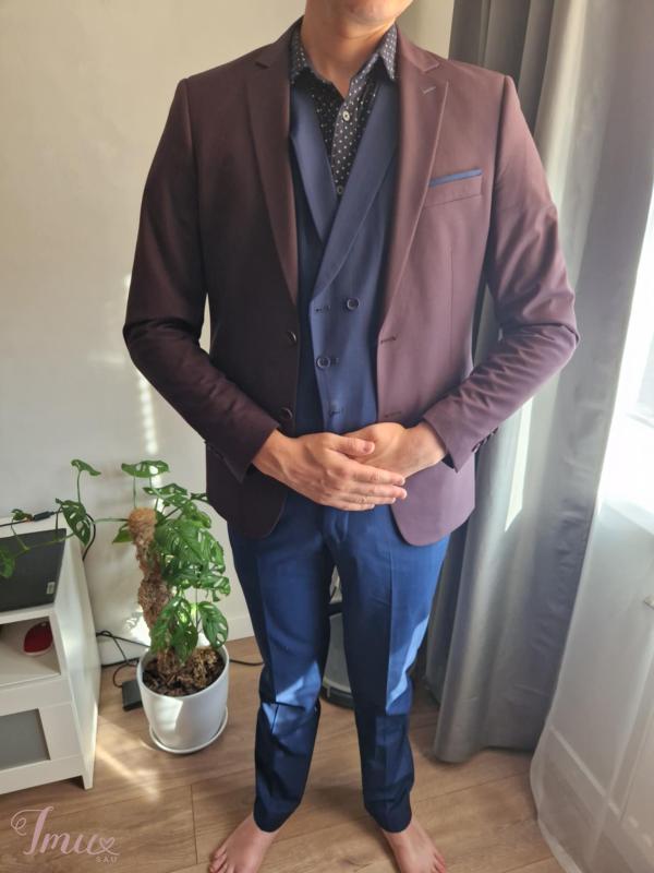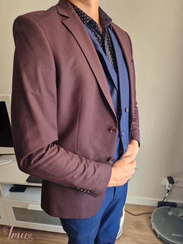 Vieną kartą dėvėtas komplektas(kelnės, liemenė ir švarkas). Be jokių defektų. Tiktų smulkesniam vyrukui, apie 175cm. ūgio.