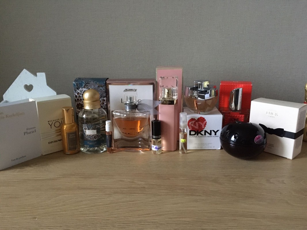 Noriu pasidalinti turimais (galiu parduoti ir visą kiekį) arba mainytis į kažką naujo :) Mano sukaupta (iš kairės): * MFK Feminin Pluriel (2 ml. mėginukas) * Emporio Armani Because It's You mot. (30 ml. be vieno pšš) * Fragonard parfumas Belle Cherie (likutis apie 15-10 ml. iš 30 ml) * Fragonard Frivole EDT (dalinuosi į atomiką, buteliukas 100 ml) * MKF Ciel de gum (2ml mėginukas) * Lancome La vie est belle (likutis iš 30 ml) * TT Porpora (Portrait of a Lady kvapo "pusbrolis" - 5 ml - minimaliai testuoti) * Hugo Boss Ma vie (galiu 1-2 atomikais pasidalinti) * TT Vele (5 ml - be kelių pšš) * DKNY My NY (naujas tik be celofano) * DKNY Delicious night (likutis ~20 ml.) * Avon Luck - naujas * Oriflame One Mielai atsiųsiu daugiau foto, jei reikės. Ar papasakosiu apie kvapus :) Viskas originalu! Mane domina Montale, MFK, Tom Form, YSL...