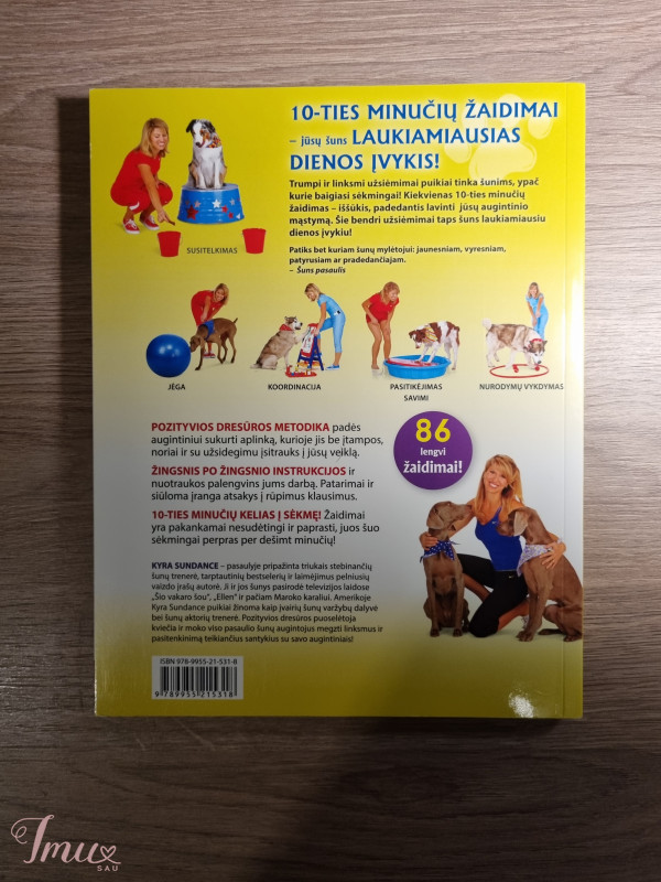 Šioje knygoje „10-ties minučių šuns dresūros užsiėmimai. Užimtam šuns šeimininkui“ aprašyti žaidimai - daugiau nei tik smagūs užsiėmimai. Kiekvienas jų yra tam tikras iššūkis jūsų šuniui, siekiant mokyti susitelkti, lavinti jo pasitikėjimą savimi, koordinaciją, jėgą ir sugebėjimą klausyti nurodymų. Prie kiekvieno žaidimo rasite langelį, pavadintą „Mokomi įgūdžiai", kuriame bus išvardintos visos mokymosi galimybės, susijusios su žaidimu. Tai išties linksma, mokomoji knyga Jums ir Jūsų augintiniui :).