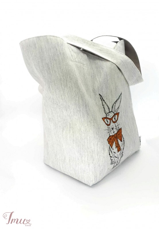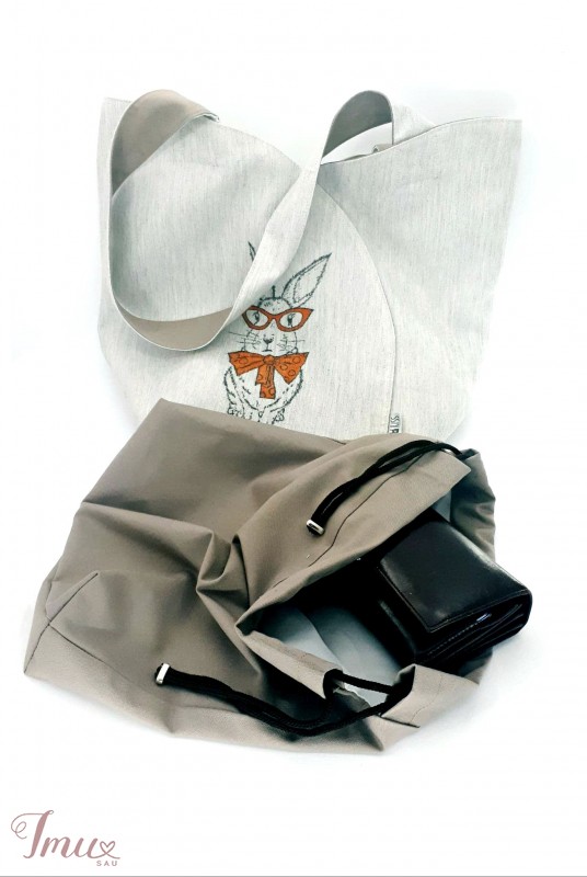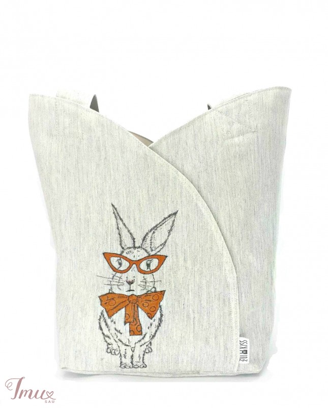 Unikalaus dizaino krepšys tik ir į miestą, ir į parduotuvę. Talpus ir tvirtas su papildomu krepšiu viduje. Krepšys puoštas pieštu zuikiu, išskirtinis ir nepakartojamas :) Dydis 34x38cm, su rankena 74cm
