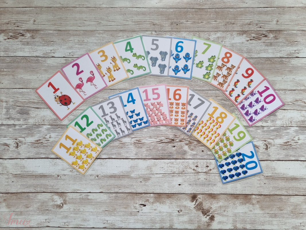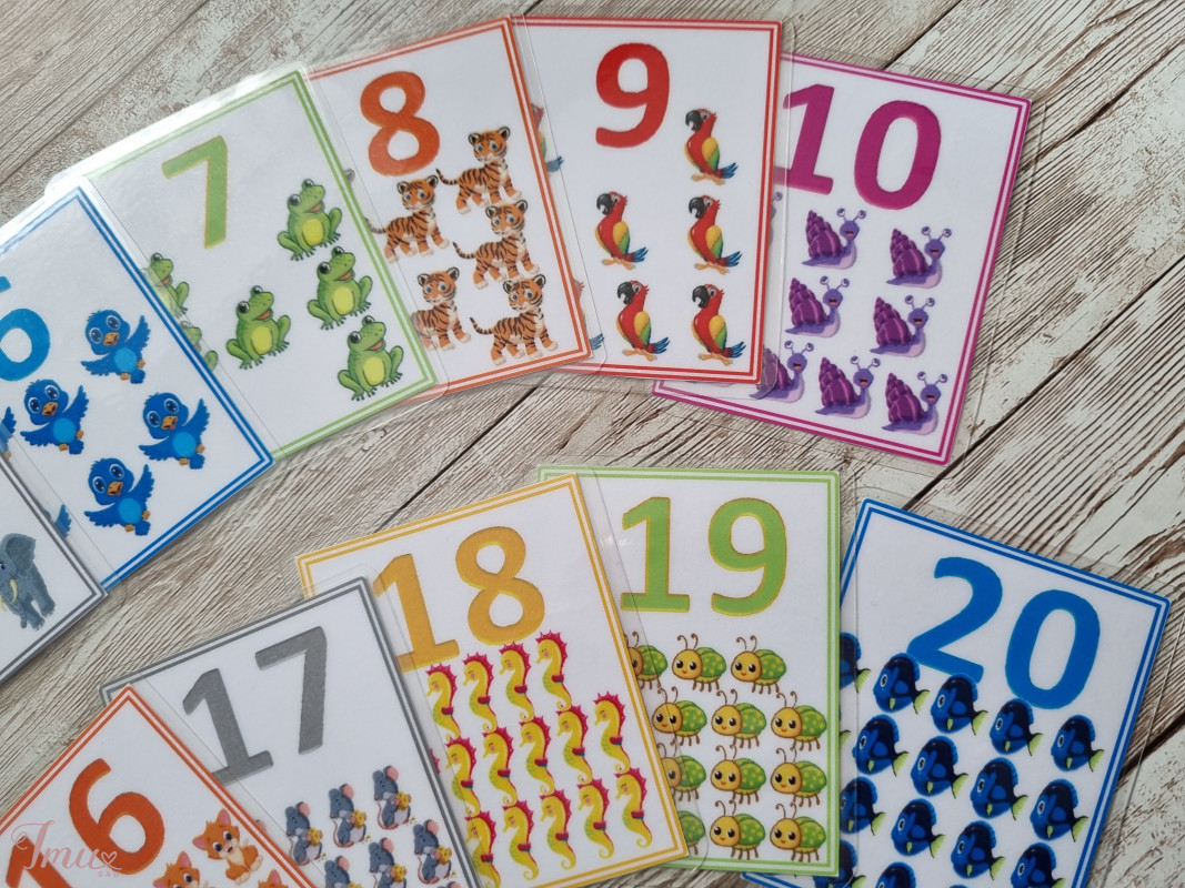 Naunos, laminuotos kortelės- skaičiai. komplekte yra 20 kortelių. Gaminu laminuotas lavinimui skirtas korteles vaikams nuo 2 metų. Kortelių dydis 7×5.5 cm. Kortelių kampai apvalinti. Kiekvienoje kortelėje yra skaičius ir paveikslėlis atitinkantis skaičiaus kiekį.