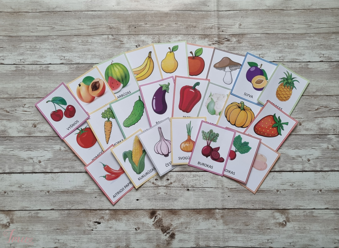 Gaminu laminuotas lavinimui skirtas užduotėles vaikams nuo 2 metų. Kortelės vaisiai ir daržovės, kiekvienoje kortelėje yra vaisius arba daržovė ir jų pavadinimas. Galima naudoti daugybę kartų tiek namuose, tiek išvykus. Užduotėlių kampai apvalinti. komplekte yra 24 kortelės, turi dėžutę susidėti.