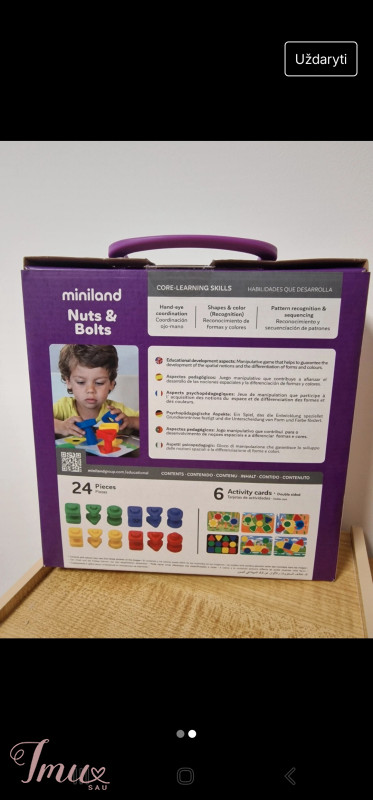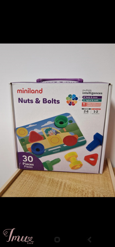 Miniland lavinamasis varžtukų rinkinys. Spalvoti, dideli varžtukai trijų pagrindinių geometrinių formų: apskritimas, kvadratas, trikampis. Žaidimas lavina smulkiąją motoriką, spalvų, formų pažinimą. Naudotas, žaistas, būklė puiki.