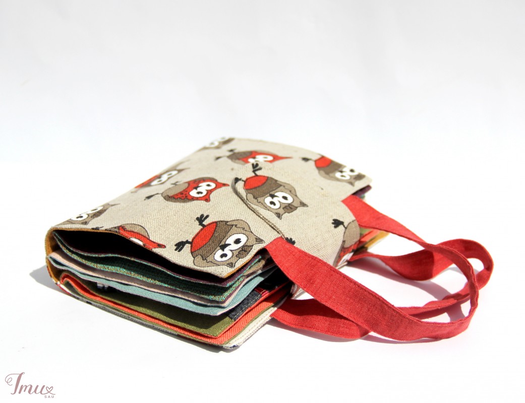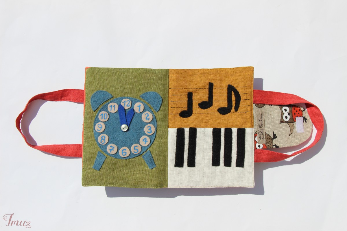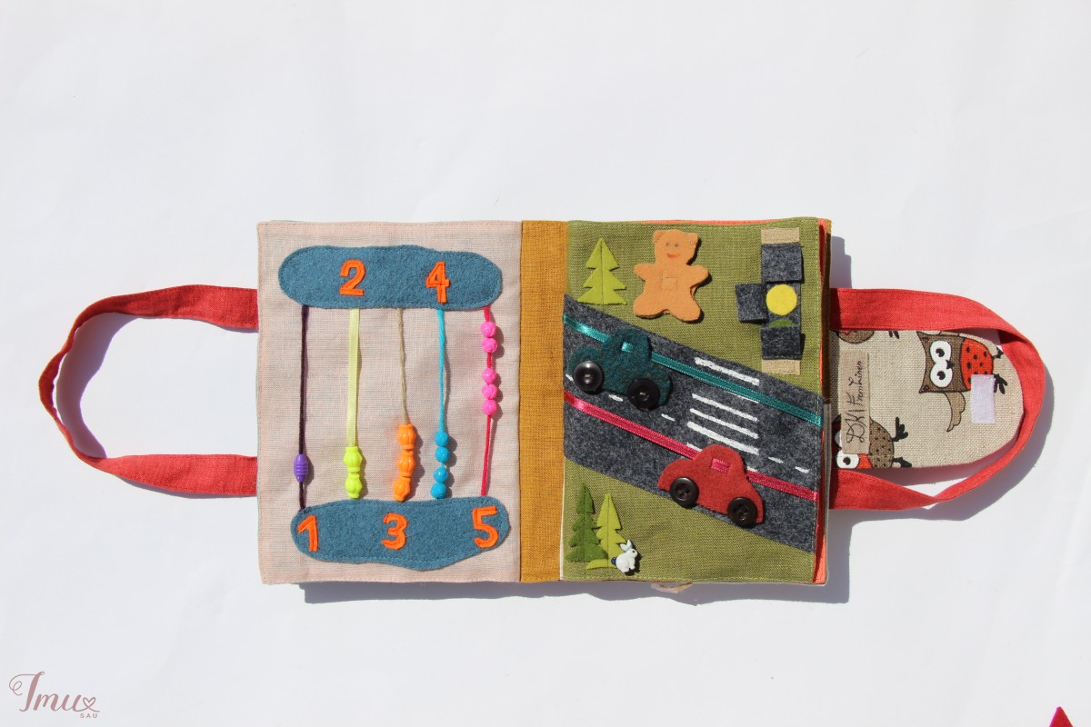 Rankų darbo lavinamoji knyga pasiūta iš lino. Knyga sudaryta iš 8 lapų. Joje rasite 11 užduotėlių, kurios lavins smulkiąją motoriką, vaizduotę, aplinkos pažinimą .Panaudota daug įvairių skirtingų medžiagų ir detalių: sagos, karoliukai, juostelės, virvelės, velcro, vilna ir kitos. Todėl rekomenduojama vaikučiams su tėvelių priežiūra arba nuo 3 metų. Tai puiki dovana vaikui ir šeimai, nes tyli knyga labai praverčia kelionėse: lėktuve, mašinoje, bažnyčioje.