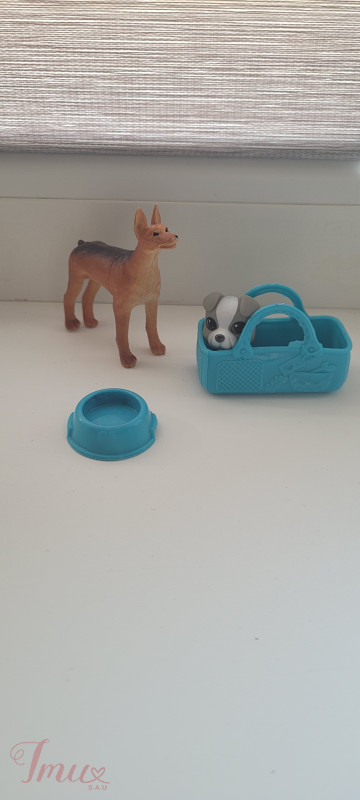 Lėlių daiktai. Krepšelis šuniukui.2 šuniukai,Dubenėlis.