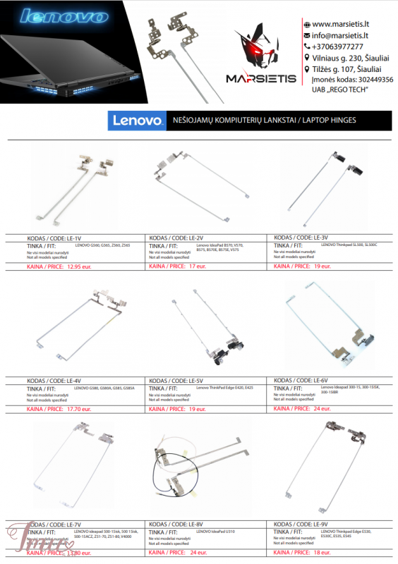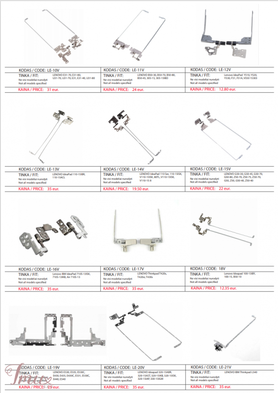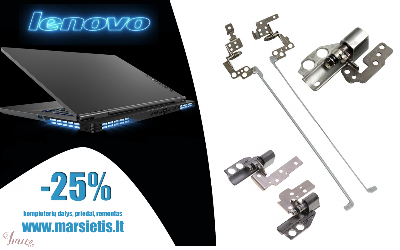 PIGIAUSIAI. LENOVO kompiuterio lankstai, vyriai, ekrano laikikliai Pristatymas visoje Lietuvoje per 1-2 d.d. (DPD kurjeriu, paštomatu, paštu, galima atsiimti vietoje). Suteikiama garantija 12 mėnesių. Visa konsultacija, remonto darbų užsakymas: +37063977277 / info@marsietis.lt / Vilniaus 230, Šiauliai Daugiau informacijos: www.marsietis.lt 1. LENOVO Thinkpad Edge E530, E530C, E535, E545 lankstai. Kaina 18 eur. 2. LENOVO ideapad 500-15isk, 500 15isk, 500-15ACZ, Z51-70, Z51-80, V4000 lankstai. Kaina 13.80 eur. 3. LENOVO B50-30, B50-70, B50-80, B50-45, 305-15, 305-15IBD lankstai. Kaina 24 eur. 4. LENOVO Ideapad 320-15ABR, 320-15AST, 320-15IKB, 320-15ISK, 320-15IAP, 330-15IGM lankstai. Kaina 35 eur. 5. Lenovo Ideapad 300-15, 300-15ISK, 300-15IBR lankstai. Kaina 24 eur. 6. LENOVO IdeaPad 110 Ser, 110-15ISK, V110-15ISK, 80TL, V110-15ISK, V110-15 8 lankstai. Kaina 19.50 eur. 7. Lenovo Ideapad 100-15IBY, 100-15, B50-10 lankstai. Kaina 12.35 eur. 8. LENOVO G50-30, G50-45, G50-70, G50-80, Z50-70, Z50-75, Z50-70, G50, Z50, G50-40, Z50-40 lankstai. Kaina 22 eur. 9. Lenovo IdeaPad Y510, Y520, Y530, F51, F51A, V550 15303 lankstai. Kaina 12.80 eur. 10. LENOVO IdeaPad 110 Touch-15ACL (80V70000US, 80V70001US 80V70007US 80V70008US 80V70009US), Lenovo IdeaPad 110-15ACL (80TJ 80TJ002CUS), Lenovo IdeaPad 110-15ACL (80TJ002DUS 80TJ008HCF), Lenovo IdeaPad 110-15ACL (80TJ00BRUS 80TJ00LRUS), Lenovo IdeaPad 110-15AST (80TR 80TR0005US), Lenovo IdeaPad 110-15AST (80TR001DUS), Lenovo IdeaPad 110-15IBR (80T7 80T70011US), Lenovo IdeaPad 110-15IBR (80T70012US 80T7002NCF), Lenovo IdeaPad 110-15IBR (80T700ABUS 80T700D6US) lankstai. Kaina 24 eur. 11. Lenovo ThinkPad Edge E420, E425 lankstai. Kaina 19 eur. 12. LENOVO G580, G580A, G585, G585A lankstai. Kaina 17 eur. 13. LENOVO IBM Thinkpad L540 lankstai. Kaina 35 eur. 14. Lenovo IdeaPad B570, V570, B575, B570E, B575E, V575 lankstai. Kaina 17 eur. 15. Lenovo IBM IdeaPad 710S-13ISK, 710S-13IKB, Air 710S-13 lankstai. Kaina 35 eur. 16. LENOVO E31-70, E31-80, U31-70, U31-70, E31, E31-40, U31-80 lankstai. Kaina 31 eur. 17. LENOVO Flex 3 14 Yoga 500-14, YOGA 500-14IBD, Flex 3-1470, Flex3-1435, Flex3-1480, Yoga 500-14IBD, 500-14IHW, 500-14ACL, 500-14ISK, 500-14IHW lankstai. Kaina 45 eur. www.marsietis.lt / info@marsietis.lt / +37063977277 Vilniaus g. 230 Šiauliai / Tilžės g. 107, Šiauliai Taip pat siūlome įsigyti ir kitų gamintojų lankstų: ACER, APPLE, ASUS, DELL, FUJITSU, HP, LENOVO, MSI, PACKARD BELL, SONY, TOSHIBA Pas mus atliekamas visų kompiuterių, apple įrenginių, telefonų, planšečių, navigacijų, fotoaparatų, vaizdo kamerų, briedžių, paspirtukų, gamybos staklių elektronikos ir t.t. remontas.