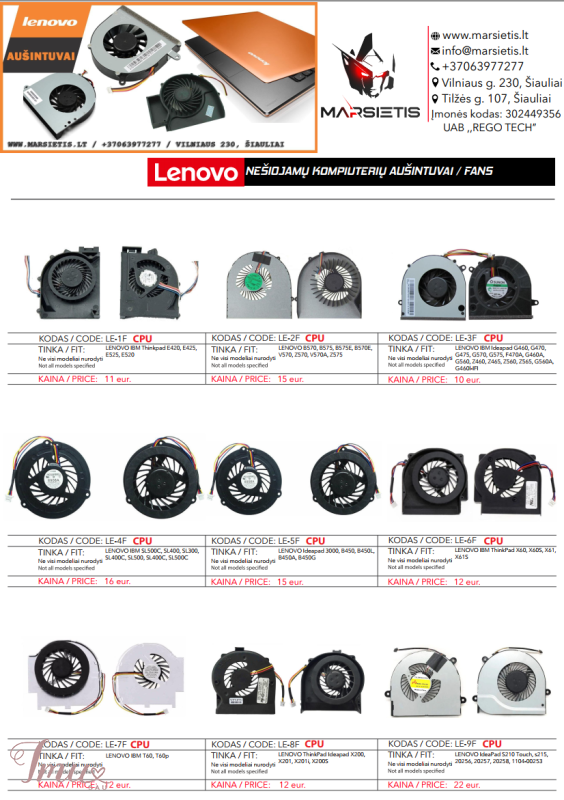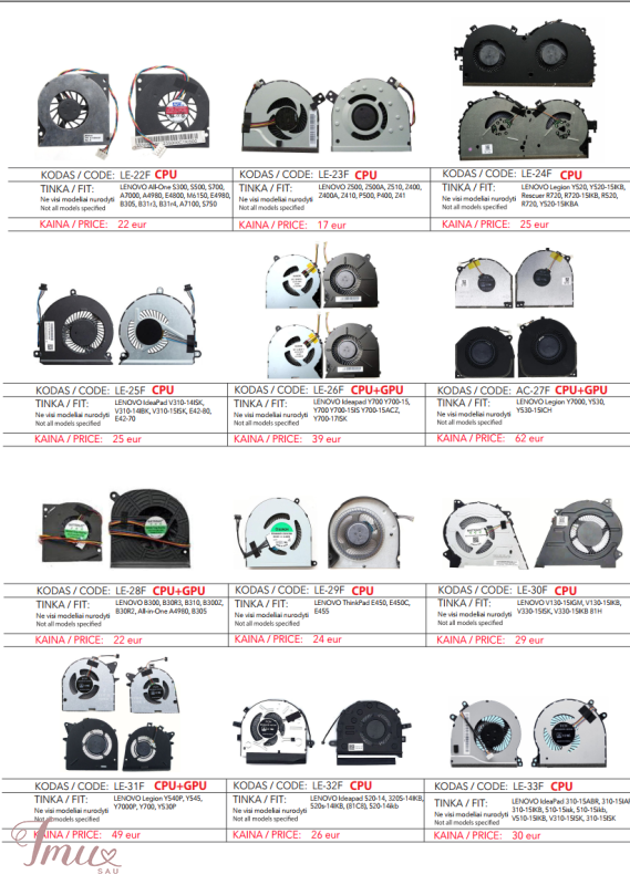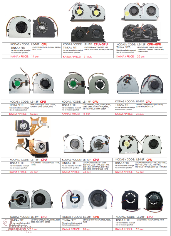 LENOVO nešiojamų kompiuterių aušintuvai / ventiliatoriai geriausia kaina Lietuvoje! Nurodyti ne visi modeliai. Pristatymas visoje Lietuvoje per 1-2 d.d. (DPD kurjeriu, paštomatu, paštu, galima atsiimti vietoje). Visa konsultacija, remonto darbų užsakymas: +37063977277 / info@marsietis.lt / Vilniaus 230, Šiauliai Daugiau informacijos: www.marsietis.lt 1. LENOVO IBM Thinkpad E420, E425, E525, E520; KSB0505HB 9J93; CPU; 4 pin. Kaina 11 eur. 2. LENOVO B570, B575, B575E, B570E, V570, Z570, V570A, Z575; KSB0605HC AK88, KSB0605HC AH72, AD07105HX09KB00; CPU; 4 pin. Kaina 15 eur. 3. LENOVO IBM Ideapad G460, G470, G475, G570, G575, F470A,G460A, G560, Z460, Z465, Z560, Z565, G560A, G460l-IFI; nfb65b05h; CPU; 4 pin. Kaina 10 eur. 4. LENOVO IBM SL500C, SL400, SL300, SL400C, SL500, SL400C, SL500C; MCF-G06PBM05,MG55100V1-Q051-S99; CPU; 4 pin. Kaina 16.00 eur. 5. LENOVO Ideapad 3000, B450, B450L, B450A, B450G; UDQF2ZR32CCM, GC055510VH-A, SB06105HB, AB7205HX-GC1; CPU; 4 pin. Kaina 15 eur. 6. LENOVO IBM ThinkPad X60, X60S, X61, X61S; MCF-W03PAM05, 42X3805; CPU; 3pin. Kaina 12 eur. 7. LENOVO IBM T60, T60p; MCF-210PAM05, 26R9434, 41V9932, 41W6407; CPU; 3pin. Kaina 12 eur. 8. LENOVO ThinkPad Ideapad X200, X201, X201i, X200S; fru45n4782; CPU; 3pin. Kaina 12 eur. 9. LENOVO IdeaPad S210 Touch, s215, 20256, 20257, 20258, 1104-00253; EG70060S1, DFS481305MC0T, EG70060S1-C010-S99, DFS481305MC0T; CPU; 4pin. Kaina 22 eur. 10. LENOVO IBM 3000 G450, B550, G450A, G455, G550, G555A; DC280004TA0; CPU; 3pin . Kaina 14 eur. 11. LENOVO Erazer Y50-70AF,Y50, Y50-70, Y50-70AM, Y50-80, Y50-70AS; EG60070S1-C060-S99,DC28000EQS0; CPU + GPU; 4pin. Kaina 21 eur. 12. LENOVO Y40, Y40-70, Y40-70AT, Y40-70AM, Y40P-80, Y40-70AT-IFI, Y40-70AT-ISE; DC28000ETF0, MF60090V1-C480-S99; CPU + GPU; 8 pin. Kaina 20 eur. 13. LENOVO Ideapad G700, G700A, G700AT, G710, G710A, Z710; AB07505HX110B00, 13n0-b5a012 b5p0b02, DFS531005PL0T; CPU; 4pin. Kaina 16 eur. 14. LENOVO B480, G480, G480A, B485, G580, G585, IdeaPad P580, P585, 20149, 20156, G480M, G580A; UDQFLJP04DCM, 0QIWG53, AB07005HX12DB00, MG60120V1-C120-S99, UDAFLJP04DCM, AY06505HX140300; CPU; 4pin. Kaina 18 eur. 15. LENOVO Ideapad U310, U310-ITH, U310-IFI TOUCH 13.3"; EG50050V1-C040-S99, 36LZ7TMLV20, MF60070V1-C180-S9A; CPU; 4pin. Kaina 24 eur. 16. LENOVO IBM Thinkpad T400s, T410s, T410si; 60Y5070AB, 60Y5145, MCF-228PAM05, 60Y5145 ; CPU; 3pin. Kaina 39 eur. 17. LENOVO Ideapad 320-15ABR, 320-15AST, 320-15IAP, 320-17IKB, 320-17ISK, 330-14AST, 320-14ISK, 520-15IKB, 330-15AST320-15IKB; DC28000DBD0,DC28000DBF0,DFS541105FC0T, DC28000DBV0; CPU; 3pin. Kaina 23 eur. Visa konsultacija, remonto darbų užsakymas: +37063977277 / info@marsietis.lt / Vilniaus 230, Šiauliai Daugiau informacijos: www.marsietis.lt 18. LENOVO IdeaPad 100-14IBD, 100-15IBD, 110-14AST, 110-15AC, 110-14Ibr, 110-15Acl, 100-15Ibd, B50-50, 110-17IKB; DC28000CVS0, DFS481305MCOT; CPU; 4 pin. Kaina 16 eur. 19. LENOVO G400s, G500s, G505s, Z501, Z505, Z501A-ITH, G510S; EG60090V1-C180-S99, DC28000DAS0; CPU; 4pin. Kaina 17 eur. 20. LENOVO IBM ThinkPad R60, R60E, R60I; 41w5269; CPU; 3 pin. Kaina 20 eur. 21. LENOVO IBM ThinkPad T410, T410I; 45M2721, 45M2722, 45M2724, 45N5908; CPU; 3 pin. Kaina 12.00 eur. 22. LENOVO All-One S300,S500, S700, A7000, A4980, E4800, M6150, E4980, B305, B31r3, B31r4,A7100, S750; 23.10429.021; CPU; 4pin. Kaina 22 eur. 23. LENOVO Z500, Z500A, Z510, Z400, Z400A, Z410, P500, P400, Z41; DFS531205HC0T, DC28000BMF0FCC2, DC28000BMF0, MG60090V1-C170-S9; CPU; 4pin. Kaina 17 eur. 24. LENOVO Legion Y520, Y520-15IKB, Rescuer R720, R720-15IKB, R520, R720,Y520-15IKBA; DFS551205WQ0T FJ9D, DC28000D6F1, EF75090S1-C060-S9A; CPU + GPU; 8pin. Kaina 25 eur. 25. LENOVO IdeaPad V310-14ISK, V310-14IBK, V310-15ISK, E42-80, E42-70; DFS531005PLOT; CPU; 4pin. Kaina 25 eur. 26. LENOVO Ideapad Y700 Y700-15, Y700 Y700-15IS Y700-15ACZ, Y700-17ISK; 80nv013bmb; CPU + GPU; 4pin. Kaina 39 eur. 27. LENOVO Legion Y7000, Y530, Y530-15ICH; 5F10R40214; CPU + GPU; 4pin. Kaina 62 eur. 28. LENOVO B300, B30R3, B310, B300Z, B30R2, All-in-One A4980, B305; DELTA BSB05505HP CT02 DT23 A01, DF5400805L10T, 5508r5h, BASA5508R5H P001; CPU + GPU; 4 pin. Kaina 22 eur. 29. LENOVO ThinkPad E450, E450C, E455; BAZA0707R5H; CPU; 5 pin. Kaina 24 eur. 30. LENOVO V130-15IGM, V130-15IKB, V330-15ISK, V330-15IKB 81H; 5F10R28076, 23.100DL.0001; CPU; 4 pin. Kaina 29 eur. 31. LENOVO Legion Y540P, Y545, Y7000P, Y700,Y530P; DFS501105PR0T; CPU + GPU; 4 pin. Kaina 49 eur. 32. LENOVO Ideapad 520-14, 320S-14IKB, 520s-14IKB, (81C8), 520-14ikb; DC28000JFF0, 5F10N67388, DC28000JFD0; CPU; 4 pin. Kaina 26 eur. 33. LENOVO IdeaPad 310-15ABR, 310-15IAP, 310-15IKB, 510-15isk, 510-15ikb, V510-15IKB, V310-15ISK, 310-15ISK; DC28000CZF0; CPU; 5 pin. Kaina 30 eur. 34. LENOVO ThinkBook 14-IIL, 14-IML, 15-IIL, 15-IML, 3-14IML05, 3-14IIL05, 3-14ITL05, 5-14IIL05, 5-14ARE05, 5-15IIL05; DQ5D576G011, 5F10S13911; CPU; 4 pin. Kaina 28 eur. KONTAKTAI: Tel. +370 677 01977 info@marsietis.lt, www.marsietis.lt Darbo laikas: I–V: 8-18 val., VI: 8-14 val. 35. LENOVO Yoga 710-14ISK, 710-14IKB, 710, 710-14, 710-15; 5F10L47319, DC28000HPF0, DC28000HRF0, DFS150305180T; CPU + GPU; 4 pin. Kaina 49 eur. 36. LENOVO ThinkPad T430, T430i; BATA0507R5U 007 04W3488; CPU; 6 pin. Kaina 25eur. 37. LENOVO Gaming Ideapad L330-15ICH, L330-17ICH; DFS531005PL0T, DC28000DLF0; CPU + GPU; 8 pin. Kaina 55 eur. 38. LENOVO Legion Y540-15IRH GTX1660, Y700, Y7000 2019 Y540 15IRH, Y7000-2019; 5F10S13889, 5F10S13886, DC28000E3S1, EG75070S1-1C010-S9A; CPU + GPU; 4 pin. Kaina 48.00 eur. 39. LENOVO Legion Y540-15IRH GTX1660, Y700, Y7000 2019 Y540 15IRH, Y7000-2019, Y540-15; 5F10S13889, 5F10S13886, DC28000E3S1, EG75070S1-1C010-S9A, EG75070S1-1C030-S9A; GPU; 4 pin.Kaina 35 eur. 40. LENOVO Yoga730-13IKB, 730-15, 730,730-15IKB; DFS2000058M0T, DC28000KQF0; CPU + GPU; 4 pin. Kaina 49 eur. 41. LENOVO Yoga 530-14IKB, 530-14ARR, Flex 6-14IKB, 6-14ARR; DFS150705BR0T; CPU + GPU; 4 pin. Kaina 25 eur. 42. LENOVO ThinkPad T440, T450, T460; BAZC0607R5H; CPU; 5 pi