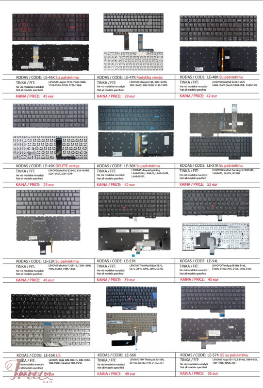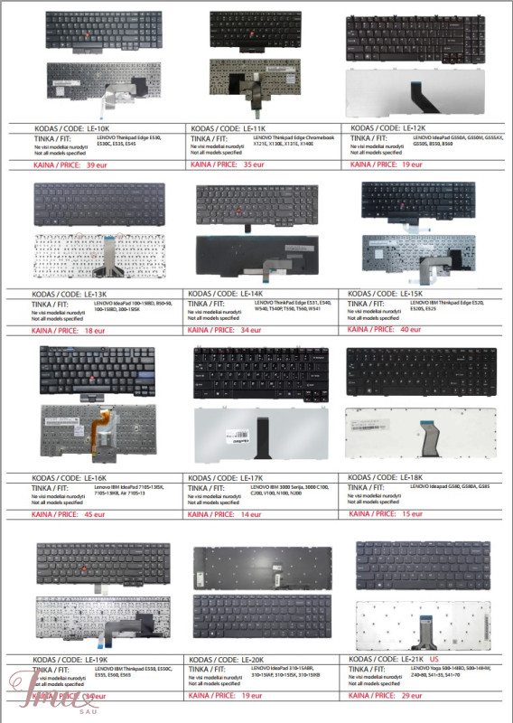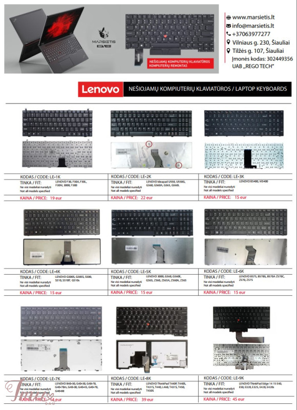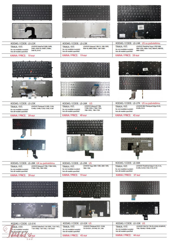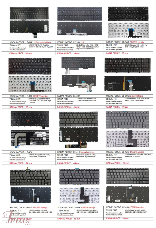 LENOVO nešiojamų kompiuterių klaviatūros geriausia kaina Lietuvoje! Nurodyti ne visi modeliai. Pristatymas visoje Lietuvoje per 1-2 d.d. (DPD kurjeriu, paštomatu, paštu, galima atsiimti vietoje). Visa konsultacija, remonto darbų užsakymas: +37063977277 / info@marsietis.lt / Vilniaus 230, Šiauliai Daugiau informacijos: www.marsietis.lt 1. LENOVO F30, F30A, F30L, F30M, 3000, Y300, V030446AS1. Kaina 19 eur. 2. LENOVO Ideapad U550, U550G, G560, G560A, G565, G560L, 25-009431, V-109820AS1-US,11S25009431ZZR0A9A909V,V-109820AS1-UI. Kaina 22 eur. 3. LENOVO G500S, G505S, S500, S510, S510P, G510s IdeaPad SS510s, IdeaPad UU510, IdeaPad ZZ510Z710Z510A G500C, G500HS, 500Z, 510 Flex 15 15D Z510A, Z510-ISE, G510S, 25211020, MP-12U73US-686, V136520PS1, 25211050, 25213753, V-136520PS1-US, V-136520SS1-US, kb137us. Kaina 15 eur. 4. LENOVO 3000, G560, G560E, G565, Z560, Z565A, Z560A, Z565 IBM Lenovo SerijaI deaPad IBM G570, G565,G770, G565LG575,G560L, G780, G560, V570, G575A C Z560A, Z508, Z50L, V-117020CS1-US, 25-012185, 11S25012185ZZR0A0AD0AA, 25-012415, MP-10A33US-6864, 25-0121186, PK130E43A17, 9Z.N5S. Kaina 15 eur. 5. LENOVO B575, B570G, B570A Z570C, Z570, Z575 IBM Lenovo Serija IdeaPad IBM B570G, B580, B590, B570A, B575, B575, B570A, B575, B575, B570, B570, B570, B57, B57, B57, B57, B57, 25-012451,V-117020BS1, V-117020FS1-US, 25-013358, 25013385, 11S25013358ZZR0A2AN05C. Kaina 15 eur. 6. LENOVO B40-30, G40-30, G40-70, G40-70m, G40-30, G40-45, G40-70, G40-80, G41-35, Flex 2-14, 2-14D, FLEX 2 14 G40 -70, B40-80U IdeaPad Z Z40-75, Z40-70 IdeaPad B B40-45, B40-70, B40-30, G40-70m, TBG1B-US, 25214569, 25214540, 25214510, 25215588, T5G1, PK130TG2A00, PK1314I3A09, 25215190. Kaina 14 eur. 7. LENOVO ThinkPad T440P, T440S, T431S, T440, L460, T431S, T450, T450S, E431, E440, L440, T460, L450, T440s, T440, L460. Kaina 39 eur. 8. LENOVO ThinkPad Edge 14 15 E40, E50, E320, E325, E420, E420s, E425, S420, KY10, 60Y9669, 60Y9597, 60Y9561. Kaina 45 eur. 9. LENOVO Thinkpad Edge E530, E530C, E535, E545, 04W0872, 1143-3BU, 0A62068, 0A62104,04W0901, 0A62075, GG-105US, 41NMWP, 04W0865, 04Y0301, 04W2480, 04W2443. Kaina 39eur. 10. LENOVO Thinkpad Edge Chromebook X121E, X130E, X131E, X140E, E120, E125, E220S, S220, E130, E130e, E135, E145, X121e . Kaina 35 eur. 11. LENOVO ideaPad G550A, G550M, G555AX,G550S, B550, B560, G550, B550A, B550G, B550L, B560A, G550G, G550L, G555, G555A, G5055V, G5055V. Kaina 19 eur. 12. LENOVO IdeaPad 100-15IBD, B50-50, 100-15IBD, 300-15ISK, 300-17ISK, 100, B50-80, 100-15IB, 100-15ISK-ITH, 100-15-IBG, B50. Kaina 18 eur. 13. LENOVO ThinkPad Edge E531, E540, W540, T540P, T550, T560, W541, L540, T540, W550s, W540, W550KM BL, KM-105U, P50S, L560. Kaina 34 eur. 14. LENOVO IBM Thinkpad Edge E520, E520S, E525. Kaina 40 eur. 15. LENOVO ThinkPad X200, X200i, X200s, X200si, X201, X201s, X201si, X201T, X200T, X201i, X201S. Kaina 45 eur. 16. LENOVO IBM 3000 Serija, 3000 C100, C200, V100, N100, N200, N220, N430, N440, G430, F31, F41, C460, C461, C462, C466, Ideapad 40, 50, Y40, 50 Y40,50 C465, C510, C467, F51, G430,G420, G530, N500, Y510A, Y710, U330, Y510M, Y300, 3000 N, 3000 V, 3000 C, Essential C, Essential F, Essential F, Essential G, IdeaPad U, IdeaPad Y. Kaina 14 eur. 17. LENOVO Ideapad G580, G580A, G585, G585A, N580,N581, N585, N586, P580, P580A, P585, Z580, Z580, Z580A, Z585, Z585, B580A, Z585, Z585, B580A, Z585, Z585, B580A, Z585,Z585, B580A, Z585, Z585, B580A, Z585, Z585, B580A, Z585, Z585, B585, 5G5G0, 5G80, 5G80 G585, G580 V580C, V585, Z585A. Kaina 15 eur. 18. LENOVO IBM Thinkpad E550, E550C, E555, E560, E565. Kaina 34 eur. 19. LENOVO IdeaPad 310-15APR, 310-15IAP, 310-15ISK, 310-15IKB Lenovo Lenovo“ serija V 310 Touch-15IKB Lenovo Ideapad 310 Touch-15ISK V310-15IKB Lenovo V310-15ISK Lenovo Yoga 510-15IKB Lenovo 310 Touch-15IKB Lenovo 310 Touch-15ISK Lenovo 310-15APR Lenovo 310-15IAP Lenovo V510-15IKB. Kaina 19 eur. 20. LENOVO Yoga 500-14IBD, 500-14IHW, Z40-80, S41-35, S41-70,500S-14ISK, 500-14ACL, 500-14ACZ. Kaina 19 eur. 21. LENOVO IdeaPad S300, S400, S405, M30-70, S400T, S400u, S40-70, S410, S415, S435, S305, S310, S436. Kaina 14 eur. 22. LENOVO Ideapad 100-15, 100-15IBY, B50-10, 80R8, 80MJ, 100-15IBD. Kaina 19 eur. 23. LENOVO ThinkPad Yoga 4 PRO 900, 900-13ISK, 900s-13isk, 900-IFI, 900-ISE, 900-13ISK2. Kaina 59 eur. 24. LENOVO Thinkpad X230S, X240, X240S, X240I, X250, X260, X230, X270, X260S. Kaina 39 eur. 25. LENOVO Ideapad Y700, Y700-15ISK, Y700-17ISK, 700-15ISK, 700-17ISK, Y700-15, Y700-17, Y700-15ACZ IBM Lenovo IdeaPad. Kaina 49 eur. 26. LENOVO Yoga 300-11IBR, 300-11IBY, 700-11ISK IdeaPad Lenovo Yoga 3 11 Lenovo Yoga 300 11,6 colių Lenovo Yoga 700-11ISK Lenovo IdeaPad Flex 3 11. Kaina 19 eur. 27. LENOVO ThinkPad Edge E120, E125, E220S, S220, E130, E135, E145, X121e, X130e, X131e. Kaina 37 eur. 28. LENOVO IdeaPad 110-15ISK, 110-17ACL, 110-17IKB, 110-17ISK, 110-15AST, V110-15IAP, V110-15IKB, V110-15ISK, 110, V110-15ISK, 110,V110-1,VIA-5M. Kaina 19 eur. 29. LENOVO Thinkpad S531, S540, S5 S5-S531, S5-540, 531, 540. Kaina 45 eur. 30. LENOVO Y50-70, Y70-70, U530, U530P-IFI, Y50, Y50-80, Y70-80, U530P. Kaina 44 eur. 31. LENOVO Flex 4, Flex 4-15, 4-1570, 1570, 4-1580, 1580, 80SB, IdeaPad Yoga 510-15IKB, 510-15ISK. Kaina 39 eur. 32. LENOVO Ideapad 310-14, 510-14, 310S-14ISK, 510, 510S-14ISK, 710-14IKB, 710-14ISK, 710-15IKB, 710-15ISK, 710-15ISK, 710-15ISK, 710-15ISK, 710-15ISK, 110-10-14,110-14-10 -14ISK, 330S-14ISK, 310S-14ISK, 510S-14ISK, 510-14ISK, 4-1480330S-14ISK, 110-14IBR, 310-14, 310-14ISK, 310-14ISK, VIA-14ISK, V1-14. Kaina 25 eur. 33. LENOVO IBM Thinkpad E580, E585, E590, E595, L580, T570, T580, T590, Thinkpad E15 Gen 2, P52, P72. Kaina 45 eur. 34. LENOVO Ideapad Y510, Y500S, Y510P, Y510S, Y500N, Y500NT, Y590. Kaina 49 eur. 35. LENOVO Thinkpad T460S, T470S, T460S, T470S, T460P, T470P, T460, T470, Lenovo ThinkPad 13, T470S00PA469 TH. Kaina 34 eur. 36. LENOVO ideapad S530-13IML, S530-13IWL, Yoga 530-14ARR, Yoga 530-14IKB, C740-14, C740-14IML, FLEX-14API, FLEX-14IML, FLEX-14IWL, C4-14IWL, 