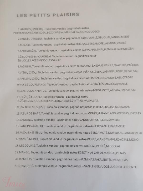 Prancūzų firmos tualetinis vanduo, tai gurmaniški, vaisių ir gėlių kvapai, kurių viena iš natų yra vanilė. Tačiau yra paletėje kelios rūšys vyriškų kvapų. Paskutinėje foto įkeltas tualetinio vandens pagal rūšį- pagrindinės kvapo natos. Perkant kelis vienetus kaina derinama.