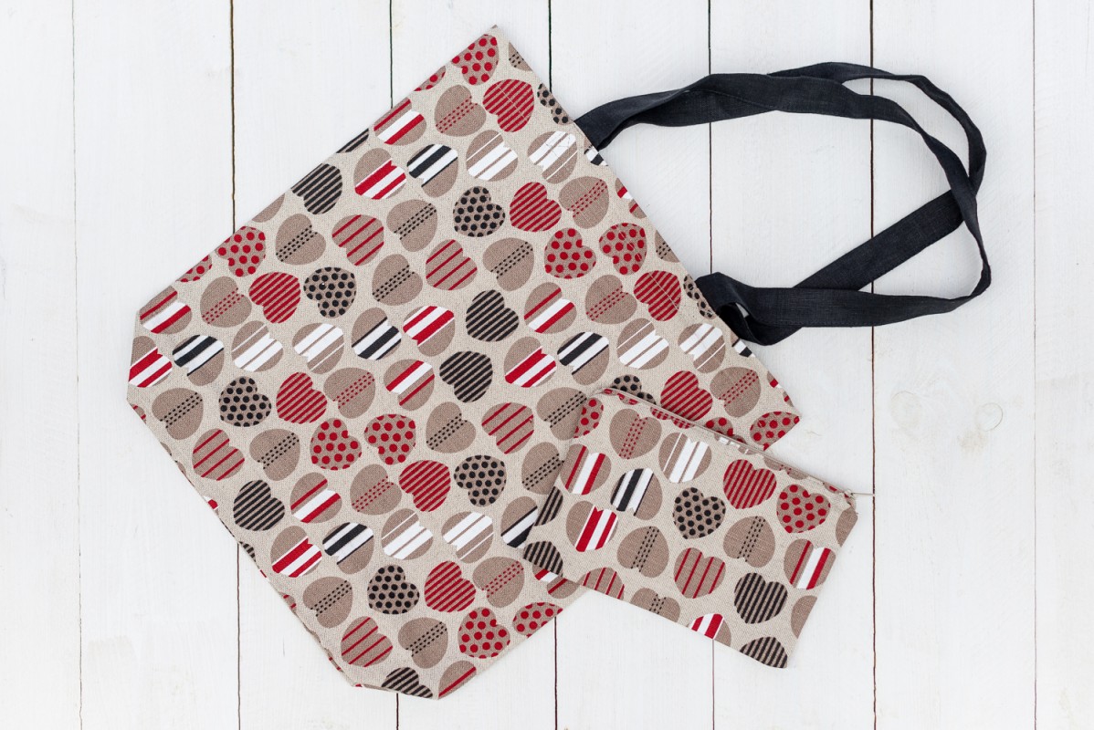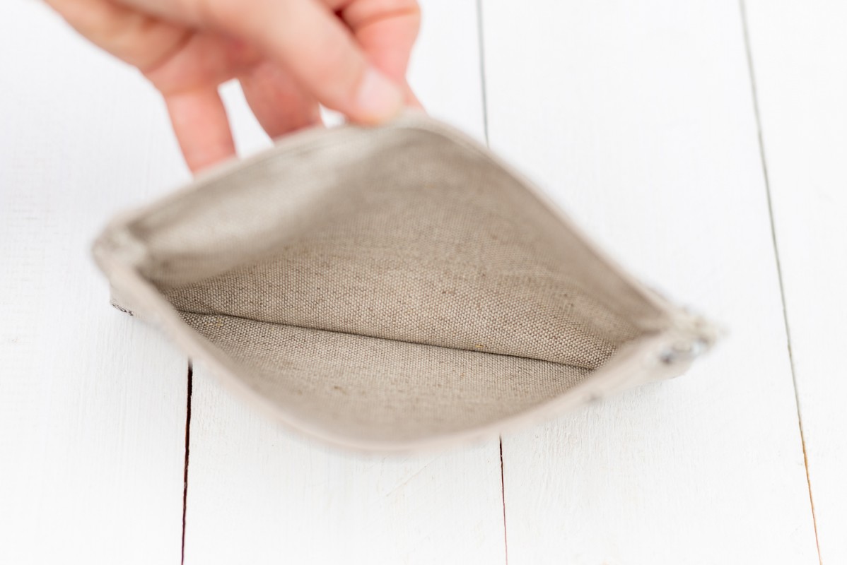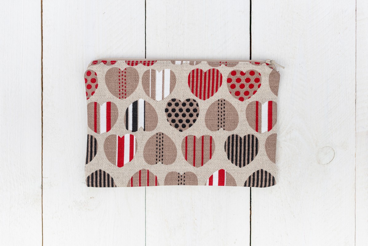 Rankų darbo kosmetinė užsegama užtrauktuku, su pamušalu. Dydis: 13 cm. × 20 cm.