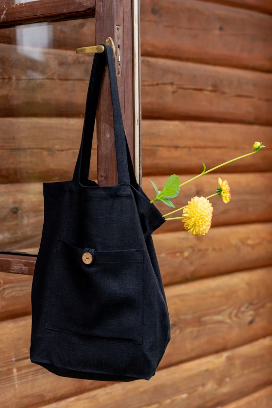 Talpus ir tvirtas krepšys su užsegama kišene. 100% linas. Dydis: 39 x 40 cm., apačia 12 cm.
