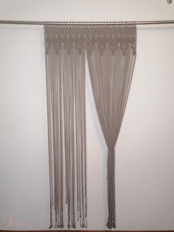 Pintos macrame technika, šviesiai pilkos spalvos, 4mm virvučių užuolaidos. Plotis 85cm ilgis 202cm. Apačią galima patrumpinti 2cm.