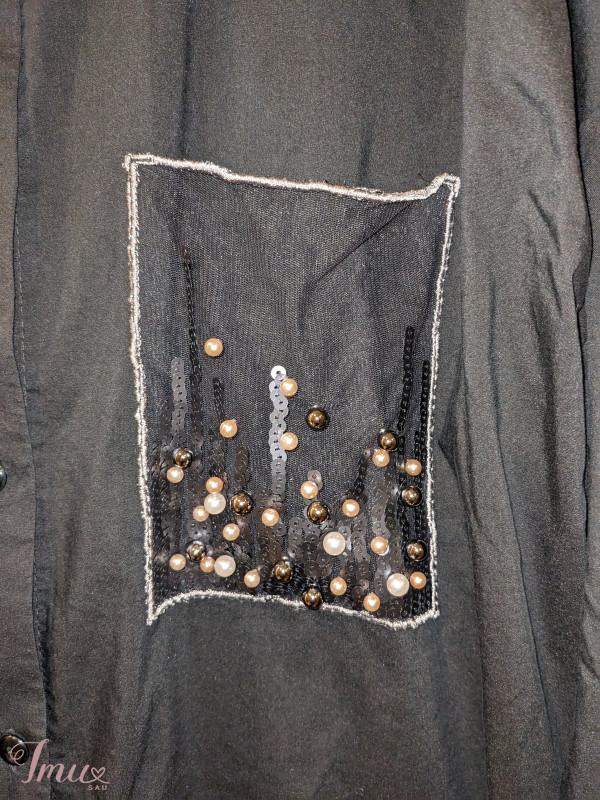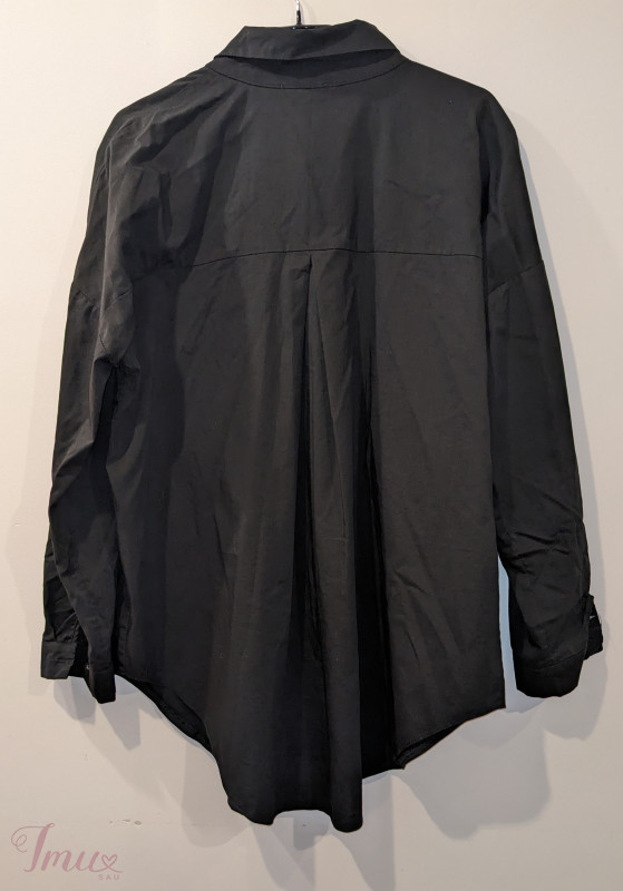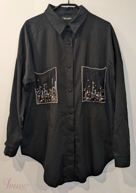Juodi oversize Manilla marškiniai su perlų kišenėmis. Galima užraitoti rankoves, yra sagutės.