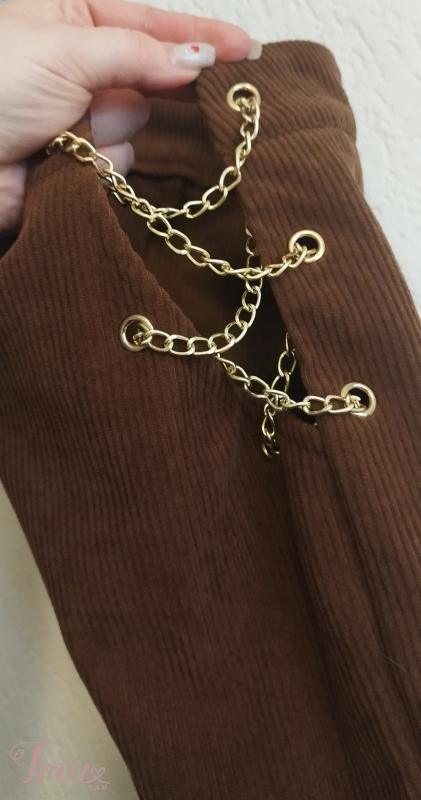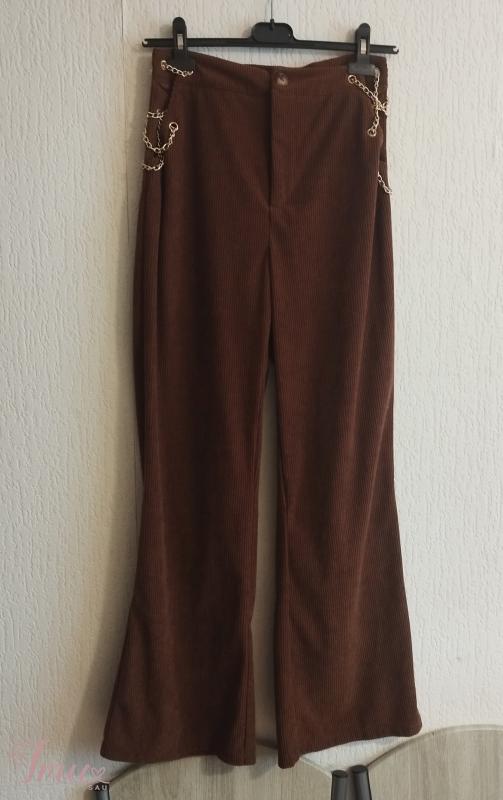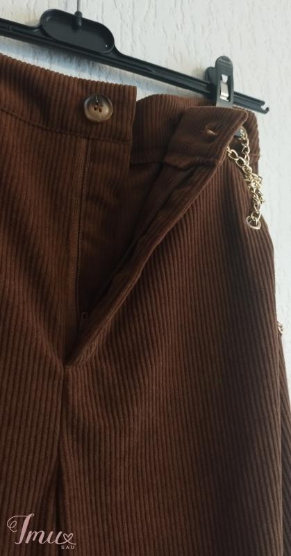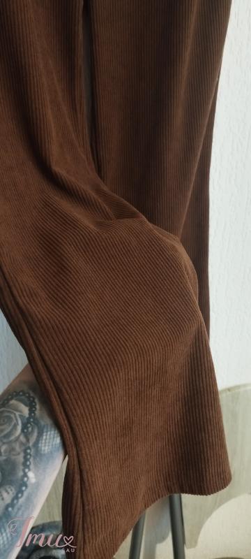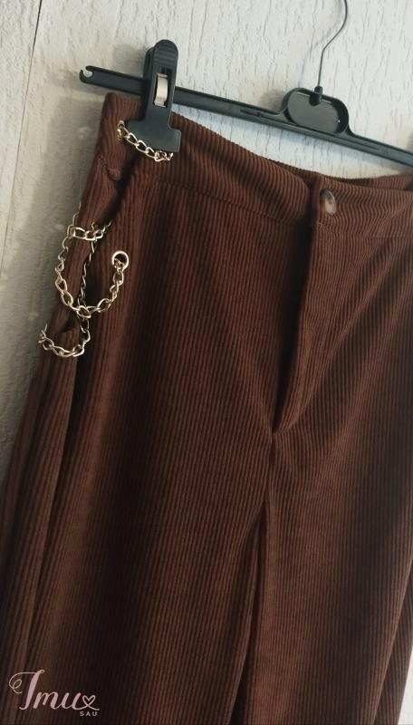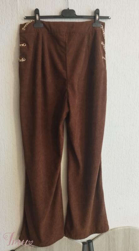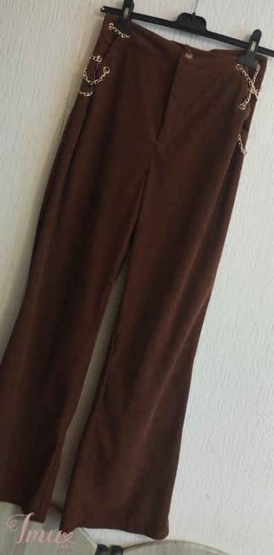 Naujos be etikečių platėjančios rudos velvetinio audinio aukšto liemens kelnės M dydžio. Elastano nelabai turi. Nesitempia. Šonuose grandinėlės, labai seksualiai atrodo. Išmatavimai: Visas ilgis 103 Nuo klynuko 70 Liemuo su grandinėlėmis 48*2, be grandinėlių matuojant, kur tik medžiaga 38*2 Klubai 50*2