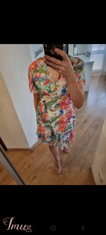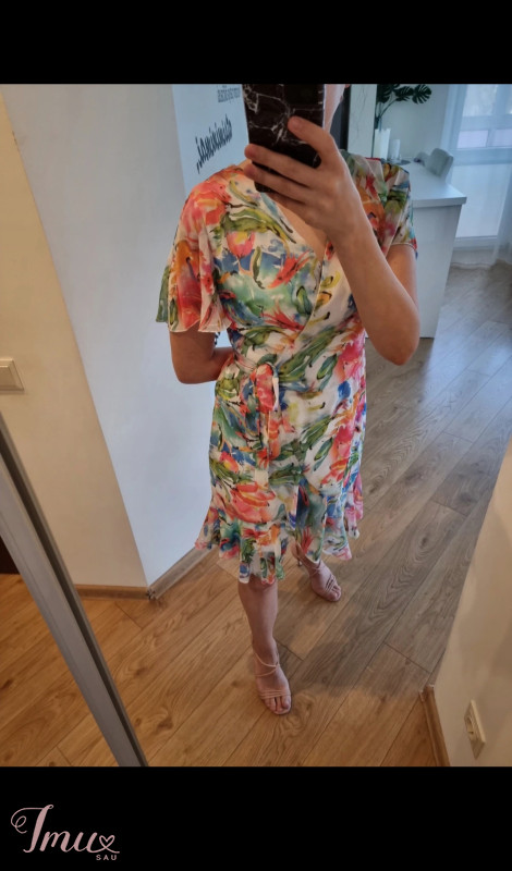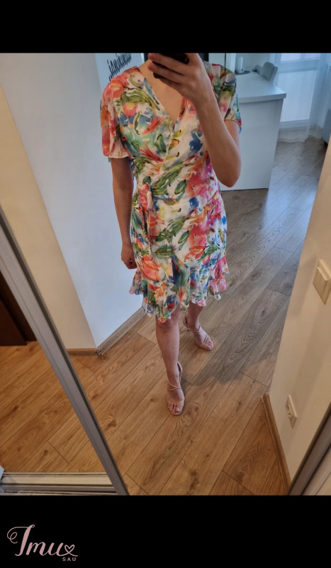 V formos iškirptė. Suknelė su gėlių/žiedų raštais. Susiriša šone, vidinėje pusėje yra sagutė. Ketvirčio ilgio rankovės. Kilmės šalis - Turkija. Sudėtis: 100% polisteris.