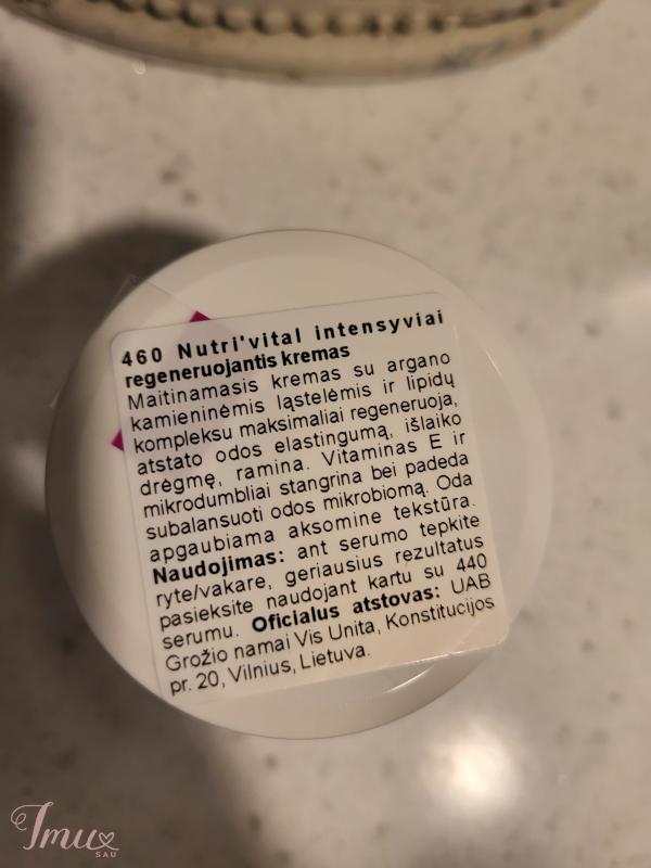 Maria Galland 460 Nutri’vital regeneruojamasis veido kremas. Profesionalus kiekis 125mlKaina parduotuvėje 50ml.99€ Maria Galland 460 NUTRI’VITAL maitinamasis kremas – tai intensyvus odos priežiūros ritualas, sukurtas sausai ir labai sausai odai. Jo prabangi tekstūra švelniai apgaubia odą, suteikdama ne tik komfortą, bet ir ilgalaikį drėkinimą. Sudėtyje esantys vertingi aliejai, taukmedžio sviestas ir keramidai padeda stiprinti odos apsauginį barjerą, o papiruso ekstraktas ir argano kamieninės ląstelės – puoselėja odos grožį. Atraskite aksominį švelnumą ir natūralų odos švytėjimą kiekvieną dien