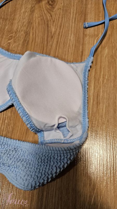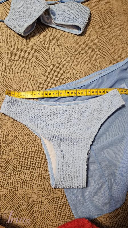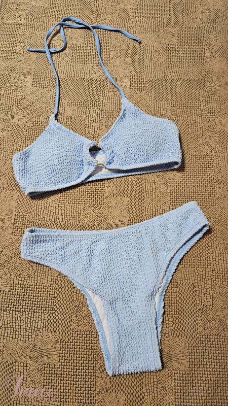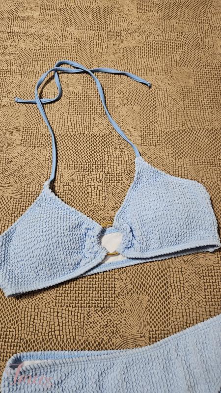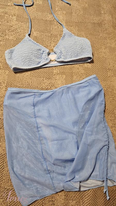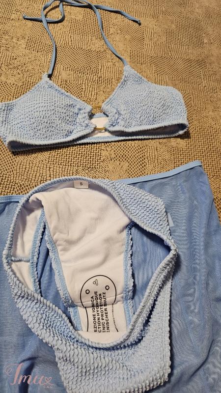 Naujas, šviesiai mėlynos spalvos, 3 dalių maudymosi kostiumėlis. Labai gražus, malonios medžiagos. Liemenėlė turi pakietinimus, bet galima juos išimti ar papildomai įdėti. Rašo dydis S, bet manau tikrai mažintas. Krūtinės apimtis ramybės būsenoje 30cm, tempiasi iki 35cm. Apatinės dalies plotis per klubus apie 32cm. Tempiasi max 40 cm.