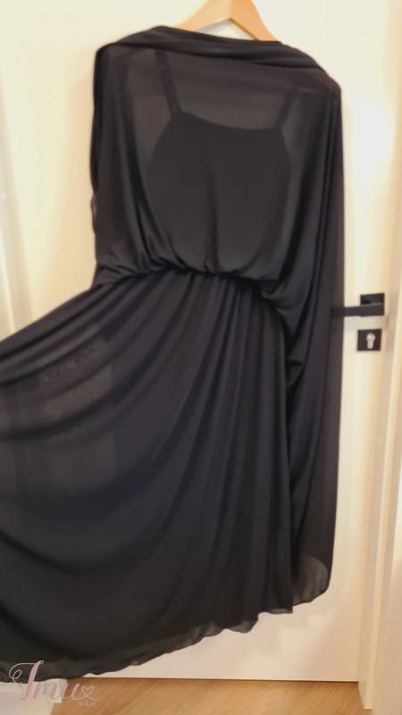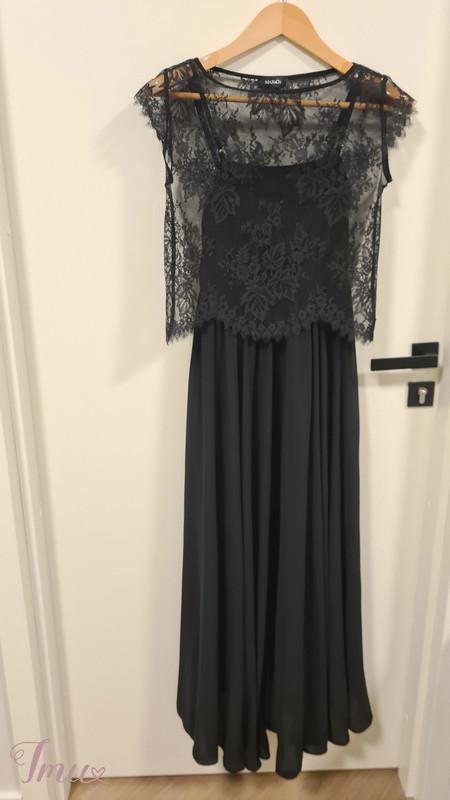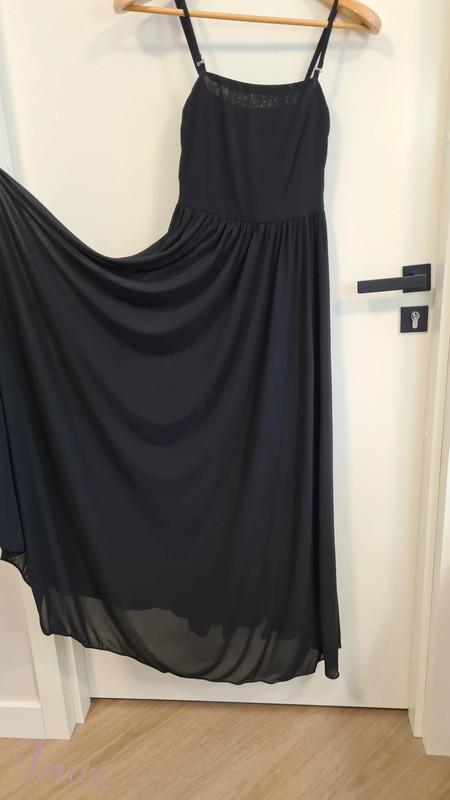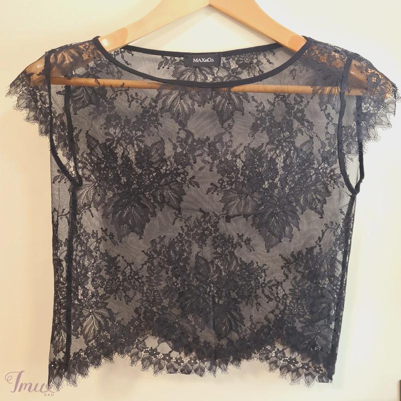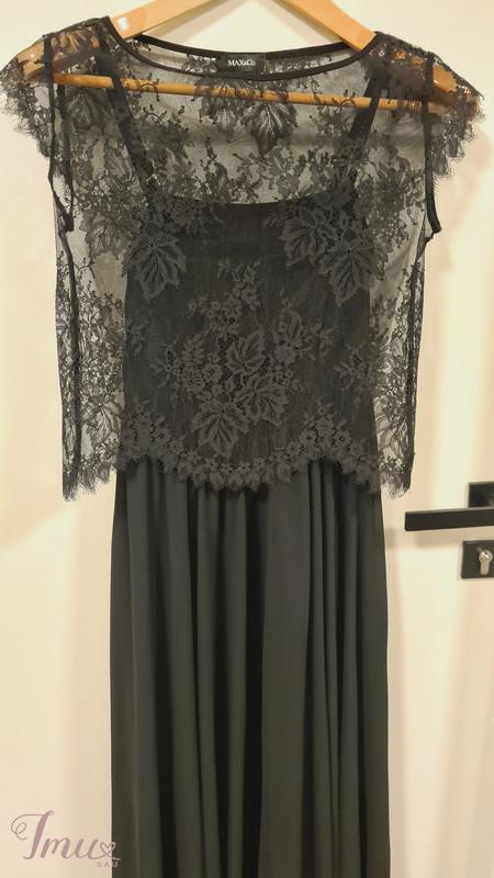 Elegantiška, išskirtinė MAX&Co. juoda suknelė: gipiūrinė palaidinukė ir suknelė ant petnešėlių. Suknelės sijonas - saulės kliošas (2,48m) - banguoja gražiomis klostėmis, palaidinukė - aukštos kokybės gražus gipiūras. S dydis. Palaidinukės krūtinės, liemens apimtis ~86cm, ilgis ~47cm. Suknelės krūtinės apimtis ~84cm, suknelės ilgis ~124cm, saulės kliošo apimtis ~248cm. Sudėtis: 100% poliesteris. Pasiuvimas tobulas. Suknelė su palaidinuke neturi jokių trūkumų, atrodo idealiai, vilkėta tik kartą.