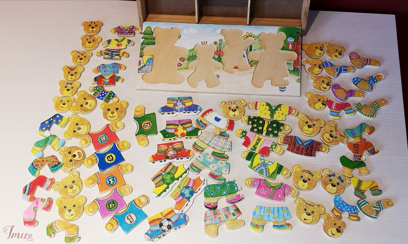 Dėlionę sudaro 72 skirtingos detalės ir dėžutė. Dėlionė gali padėti lavinti smulkiąją motoriką, akyčių-rankyčių koordinaciją, estetinį suvokimą, skatinti kūrybiškai mąstyti. Meškiukai turi skirtingas veido išraiškas, tad vaikas mokomas suvokti skirtingus jausmus, gali modeliuoti skirtingas šeimynines situacijas. Paskutinėje foto atskirai nufotografavau pasidėvėjusias detales iš arčiau. Dėžutės dydis: 32 x 15 x 4 cm. Nemokamas siuntimas.