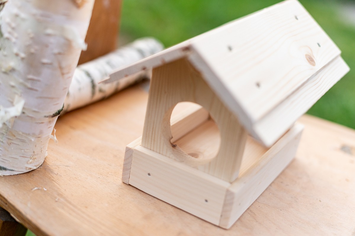 Rankų darbo medinė lesyklėlė paukščiukams. Pagrindo plotis 12 cm., ilgis 20 cm., aukštis 18 cm.