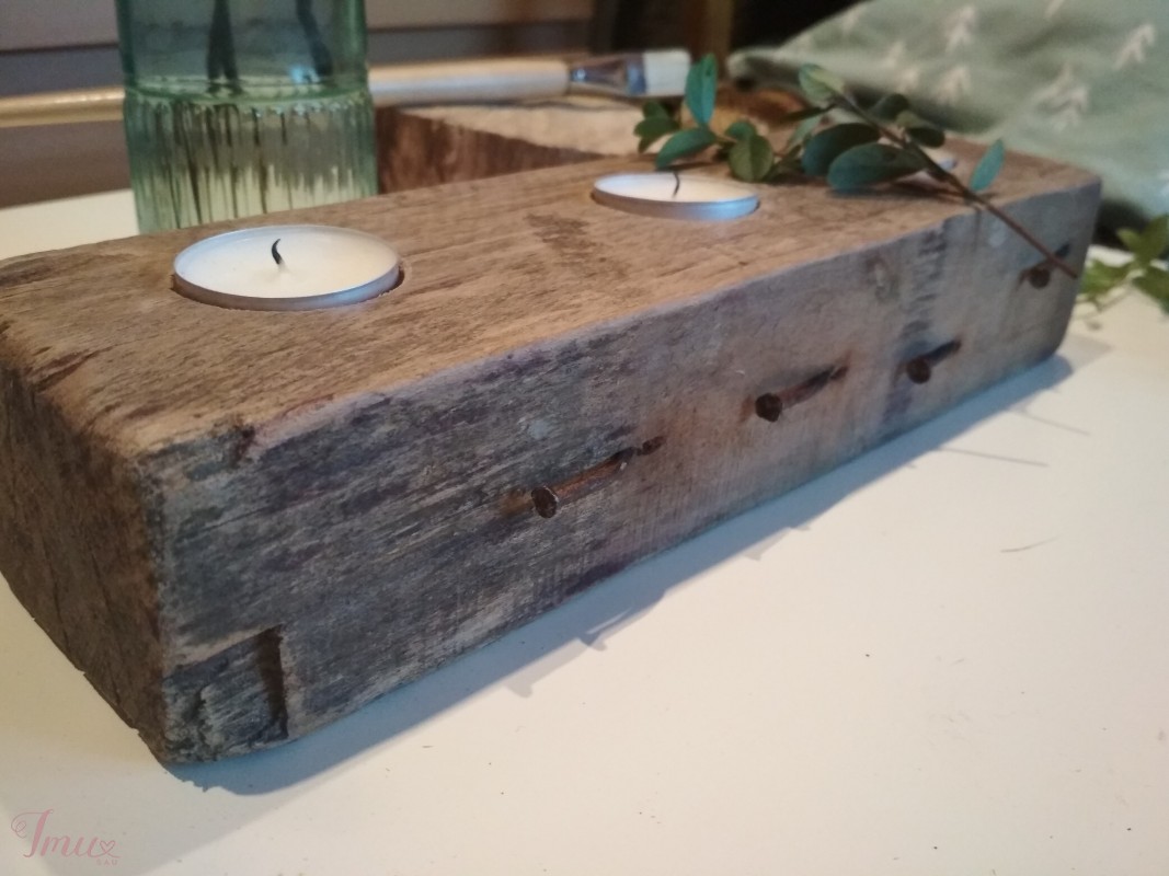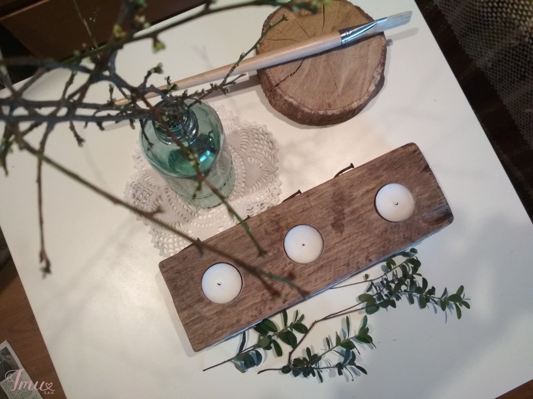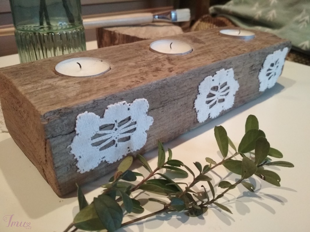 Rankų darbo žvakidė iš senos medienos (pušies mediena, vandens pagrindo lakas medienai, nėriniai, 3 arbatinės žvakutės). 29x9x5 cm