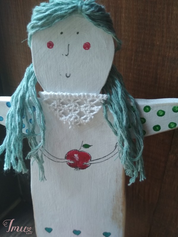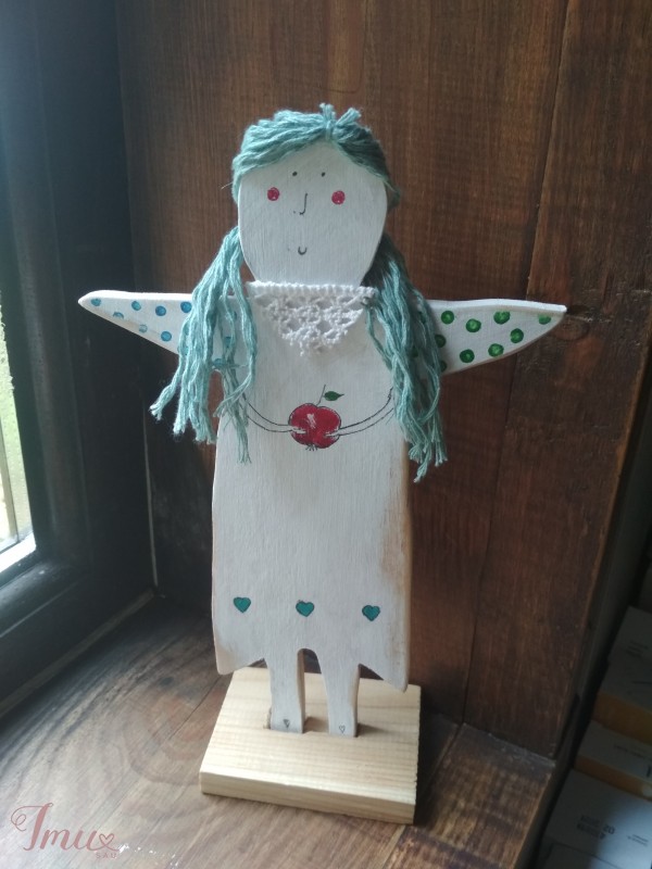 Rankų darbo angelas (klijuota mediena, akriliniai dažai). Aukštis 25 cm, plotis 16 cm, storis apie 1cm