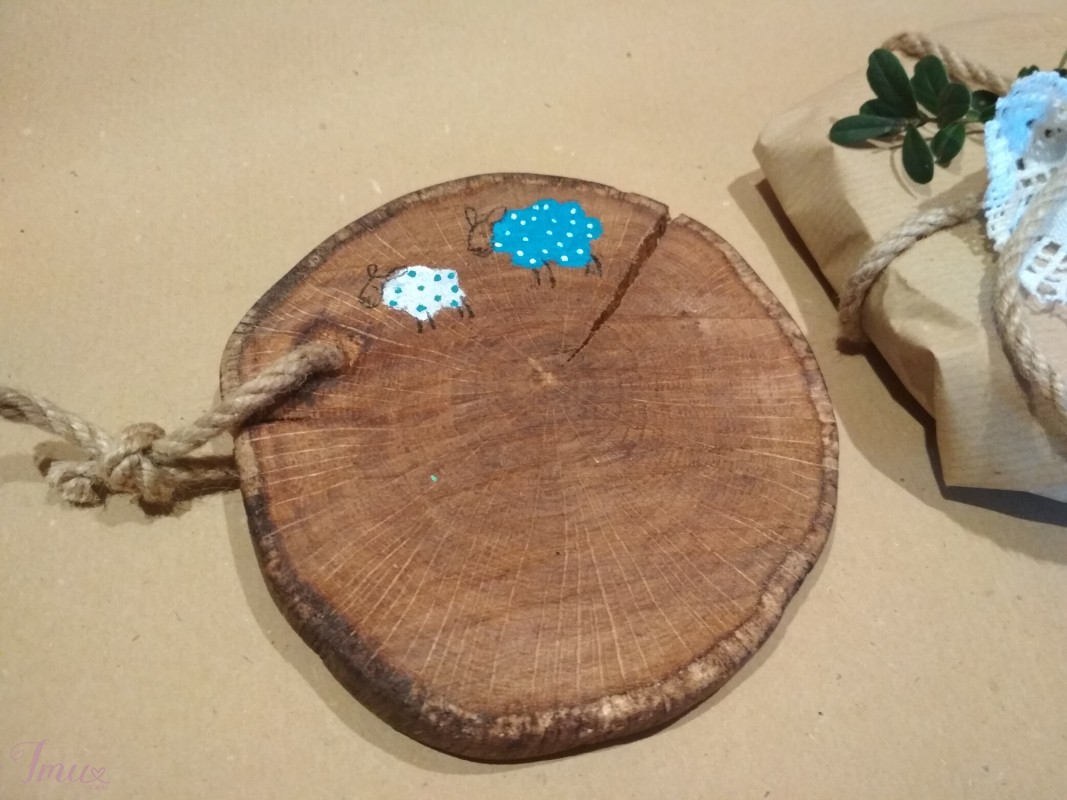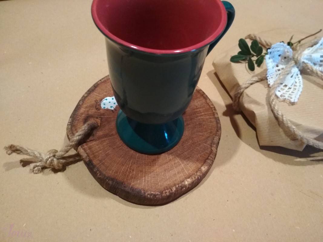 Rankų darbo medinis padėkliukas puodeliui, žvakutei ( linų sėmenų aliejus, akriliniai dažai, virvė) 14x1 cm