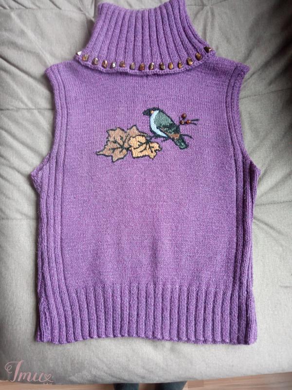Nors už lango dar ne balta, Be liemenės gal kam šalta? Mezgiau ją su ugnele, Betgi - gavosi maža. Panešiojau ją truputį. Liūdna spintos jai kamputį. Siūlai švelnūs, lyg vilnoniai, Galgi tiktų kokiai poniai. Mezginys nors autorinis - Kaina - ne milijoninė. (18 e. Tiktų moteriai, nešiojančiai 42 dydžio drabužius. Ilgis - 57(, pečiai 41, Liemuo - 44 cm. Yra kiek įlėmenuota, labai švelnių, šiltų kokybiškų siūlų. Spalva kiek kitokia, nei nuotraukose, pakeičia fotoaparatas, tokia tarpinė. Kaklas labai gražiai prisiglaudžia, nespaudžia, neduria, apačioje išsiskleidžia.