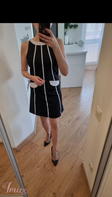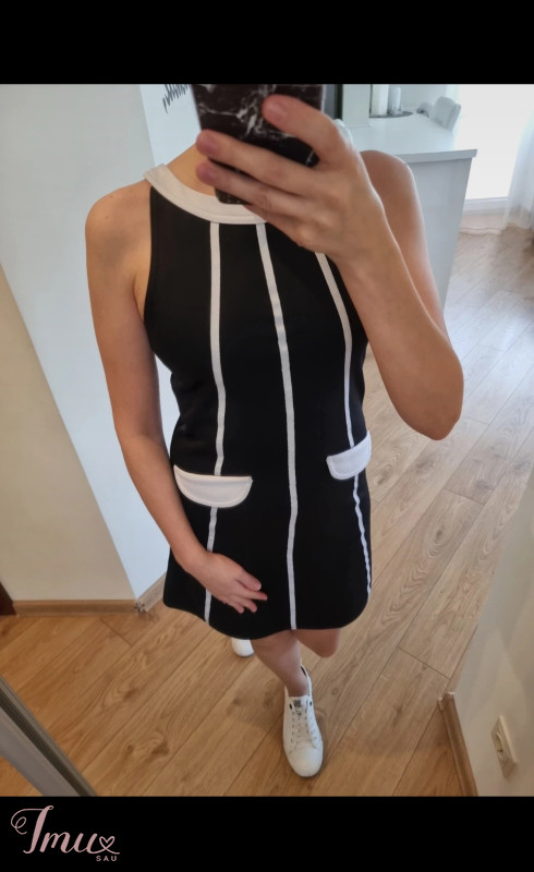 Tamsiai mėlynos spalvos su baltais dryžiais suknelė. Nugara vienspalvė, tamsiai mėlina. Kišenių imitacija. Užtrauktukas nugaroje. Sudėtis: 100% polyester. Dydį rašo 14, sakyčiau XS ar smulkiam S (fotografuota ant XS).