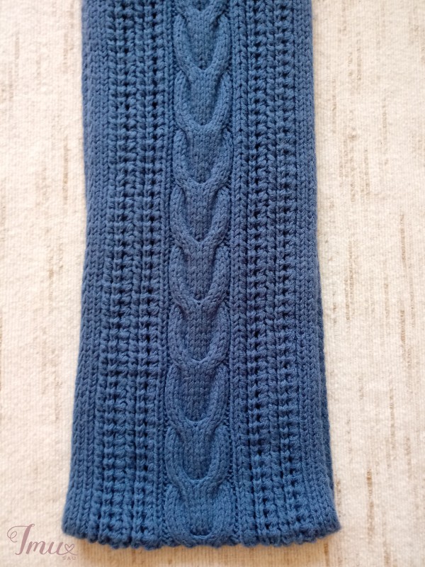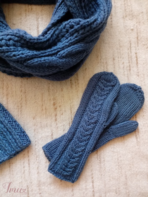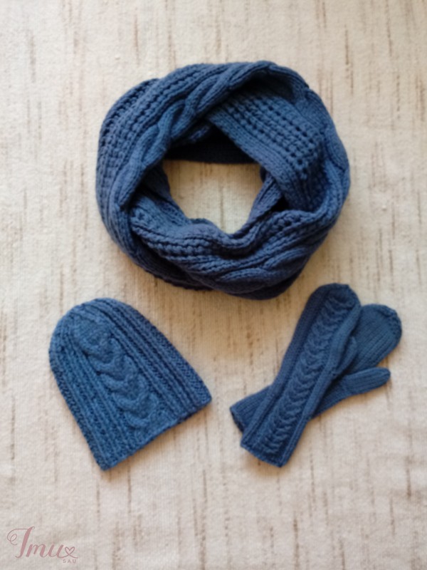 Komplektas - mėlynas šalikas/mova, kepurė ir pirštinės. Sudėtis - pusvilnė. Šiltas, tamprus, rankų darbo. Šaliko išmatavimai ramybės būsenoje 184 x 28 cm. Skalbti rankomis.
