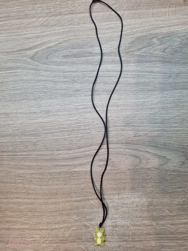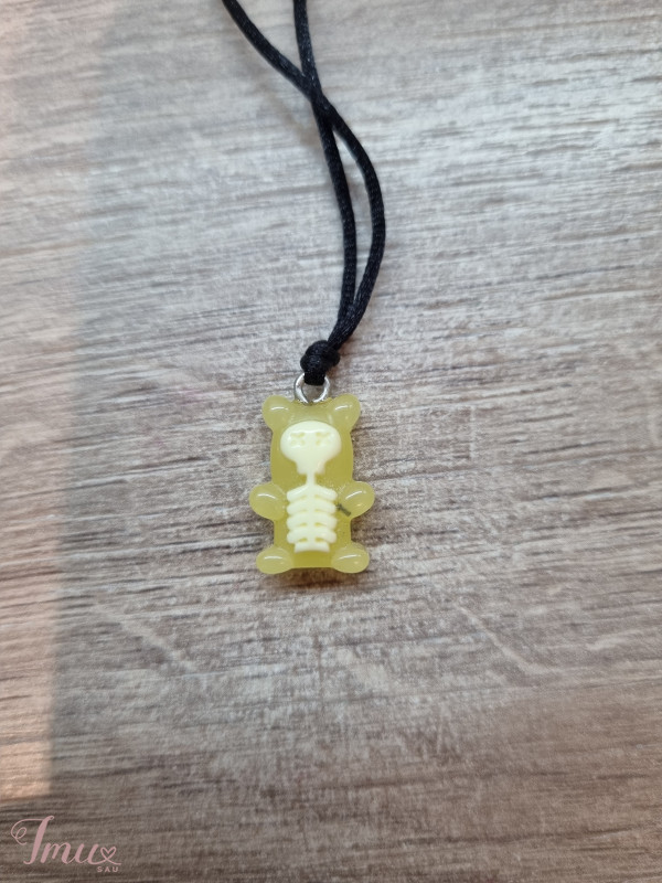 Puikios būklės meškučio pakabukas. Pakabukas geltonos spalvos, o kaukolė kreminės. Virvelė yra juodos spalvos, dydis reguliuojamas :).