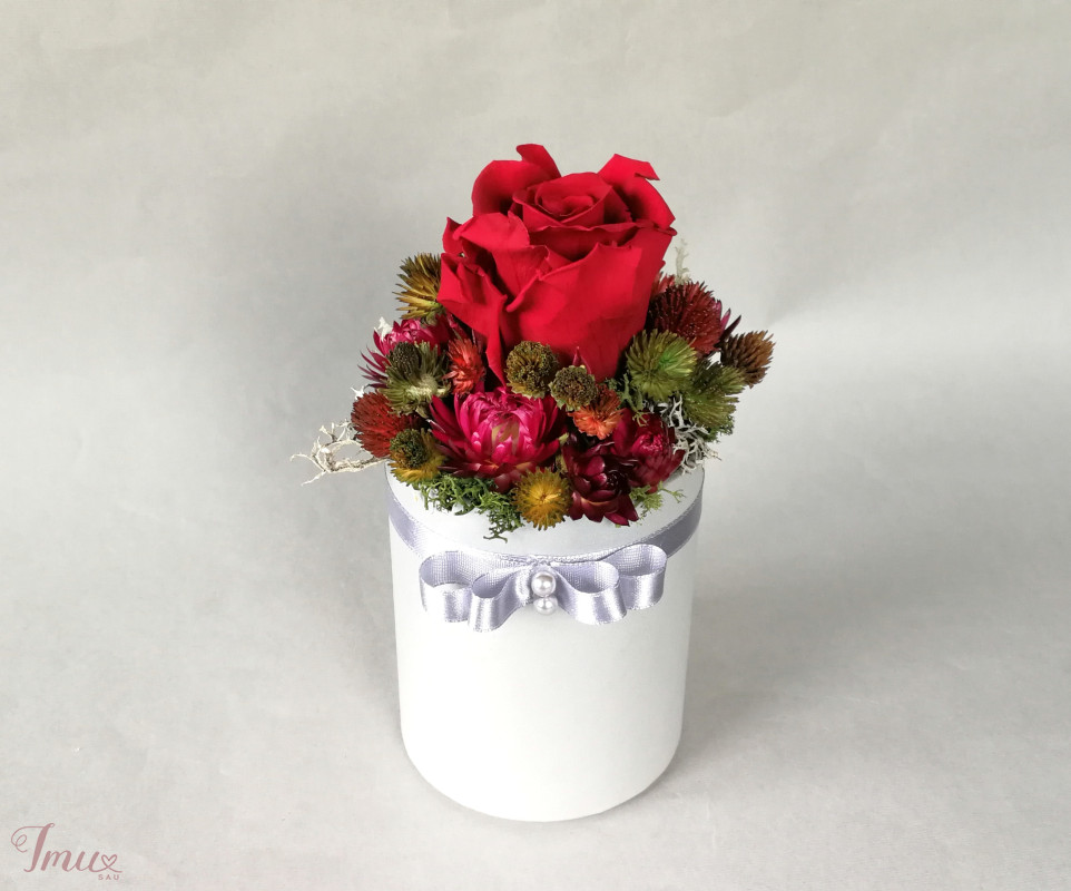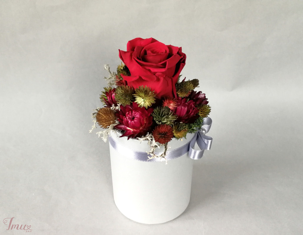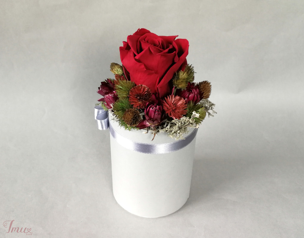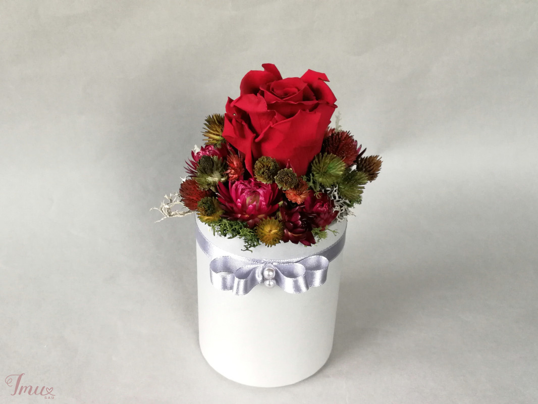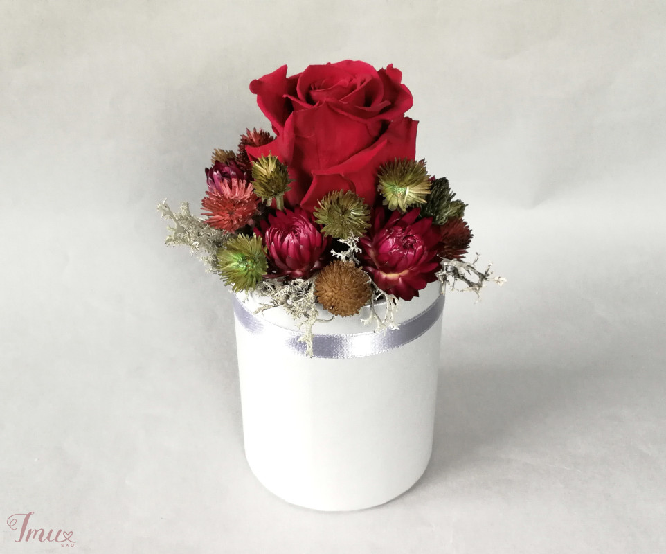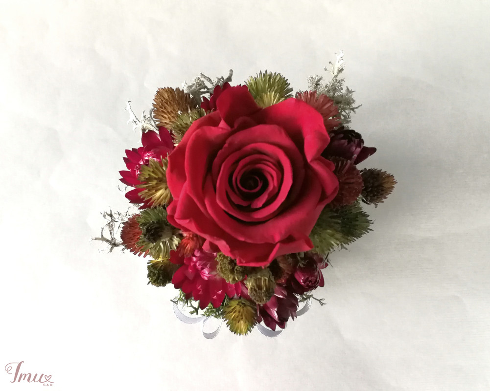 Mieganti raudona rožė su sausuoliais ir stabilizuotom samanom, augalais pilkoje dėžutėje. Aukštis nuo stalo apie 16 cm, žiedyno skersmuo apie 10 cm, dėžutės dugno skersmuo 8 cm. Ši kompozicija ilgai puoš namus (iki 3 metų). Nelaikykite saulėje ir drėgmėje. Dulkes atsargiai nupūskite su plaukų džiovintuvu. Visas pagamintas ir šiuo metu turimas kompozicijas rasite fb: https://www.facebook.com/geliudirbtuveles/shop/?view_public_for=1902406066516325&ref_code=mini_shop_profile_plus_shop_tab_cta&ref_surface=profile arba su mygtuku "pirkti" : Lietuviška prekė- https://www.lietuviskapreke.lt/parduotuves/dkfromlinen