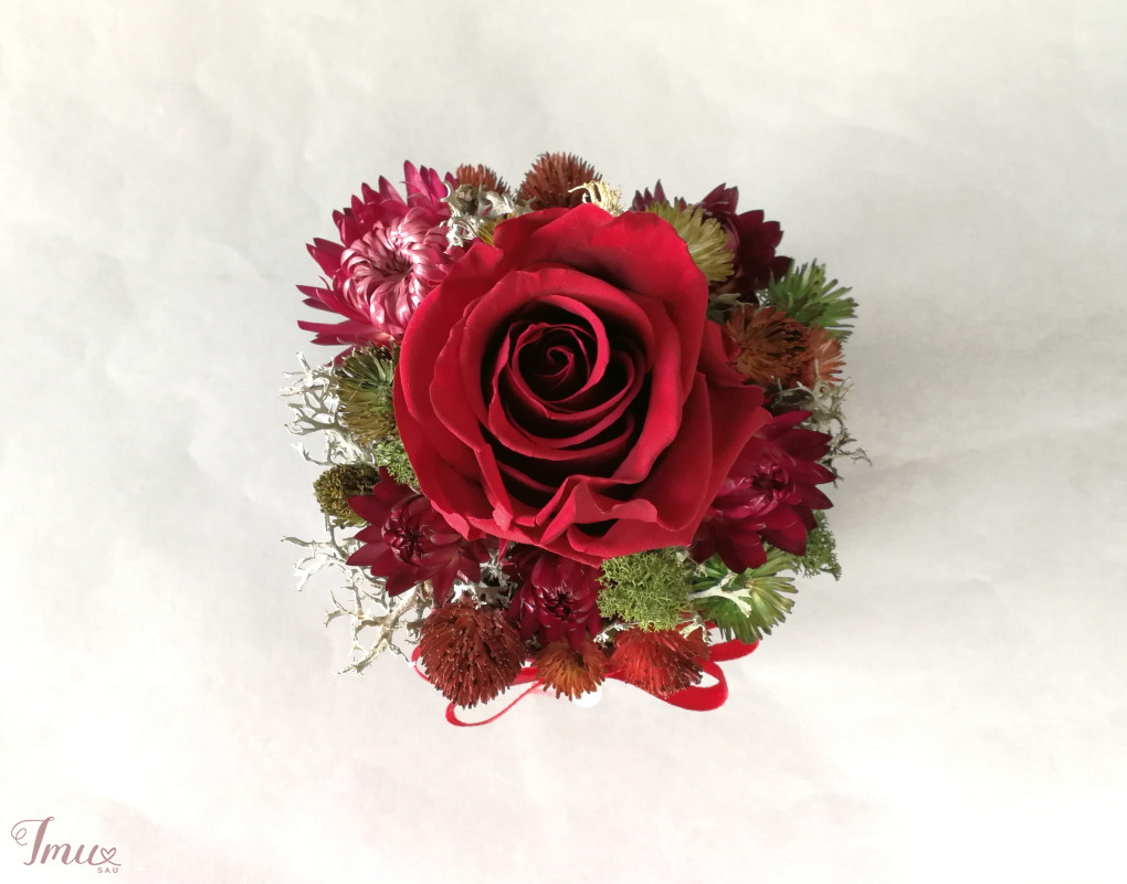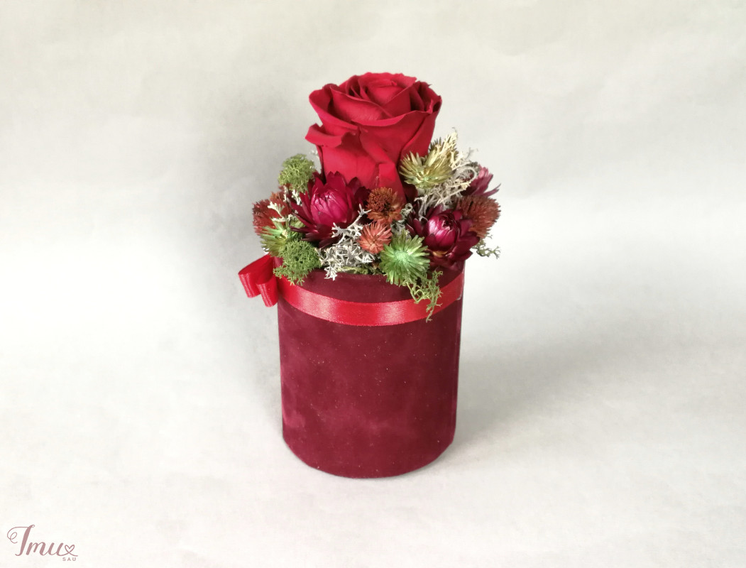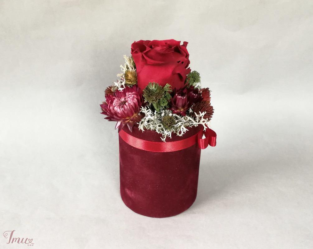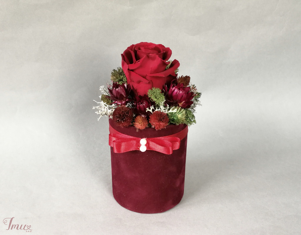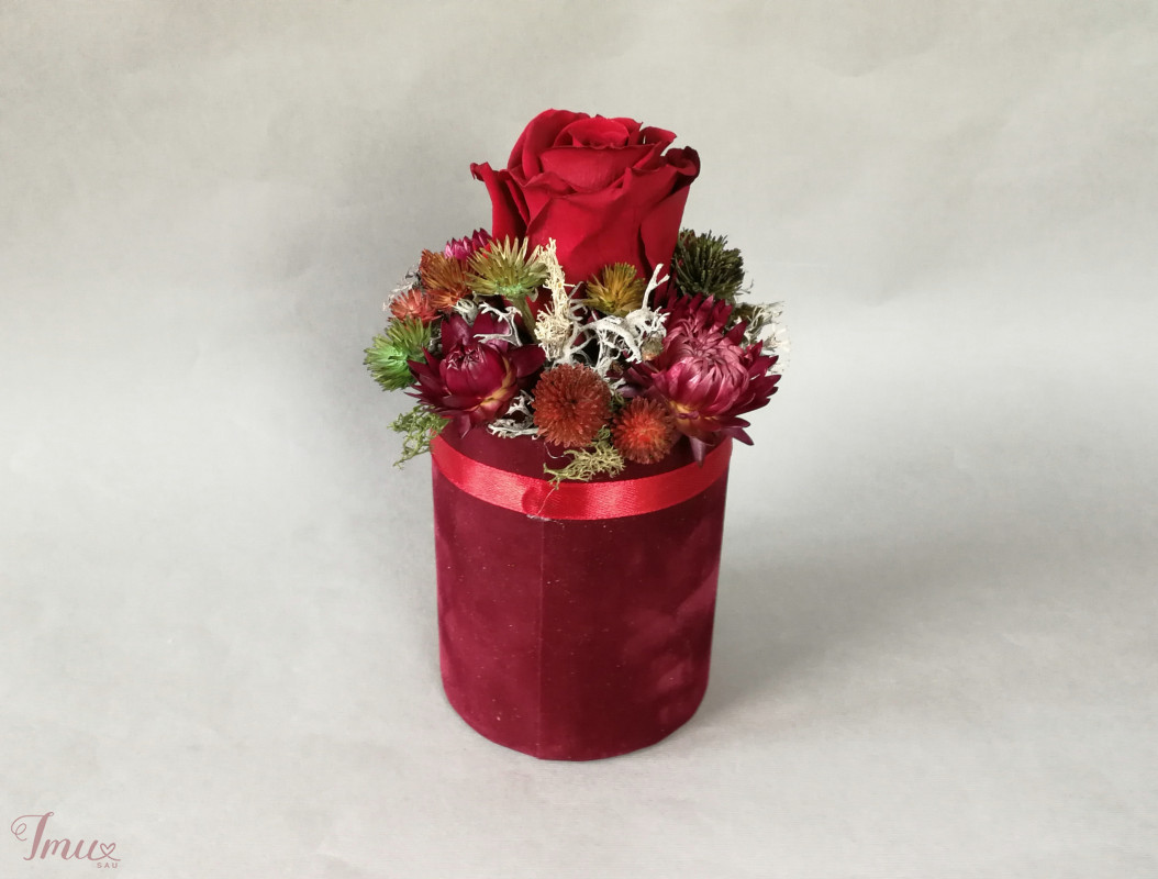 Mieganti rožė su sausuoliais ir stabilizuotom samanom, augalais. Aukštis nuo stalo apie 16 cm, žiedyno skersmuo apie 11 cm, dėžutės dugno skersmuo 8 cm. Raudona rožė- vyšninės spalvos veliūro dėžutėje. Ši kompozicija ilgai puoš namus (iki 3 metų). Nelaikykite saulėje ir drėgmėje. Dulkes atsargiai nupūskite su plaukų džiovintuvu. Visas pagamintas ir šiuo metu turimas kompozicijas rasite fb: https://www.facebook.com/geliudirbtuveles/shop/?view_public_for=1902406066516325&ref_code=mini_shop_profile_plus_shop_tab_cta&ref_surface=profile arba su mygtuku "pirkti" : Lietuviška prekė- https://www.lietuviskapreke.lt/parduotuves/dkfromlinen