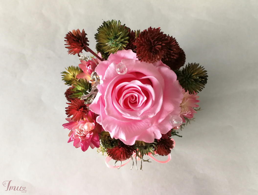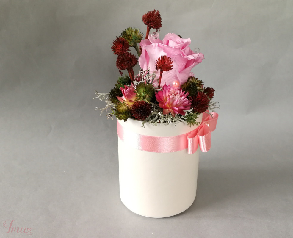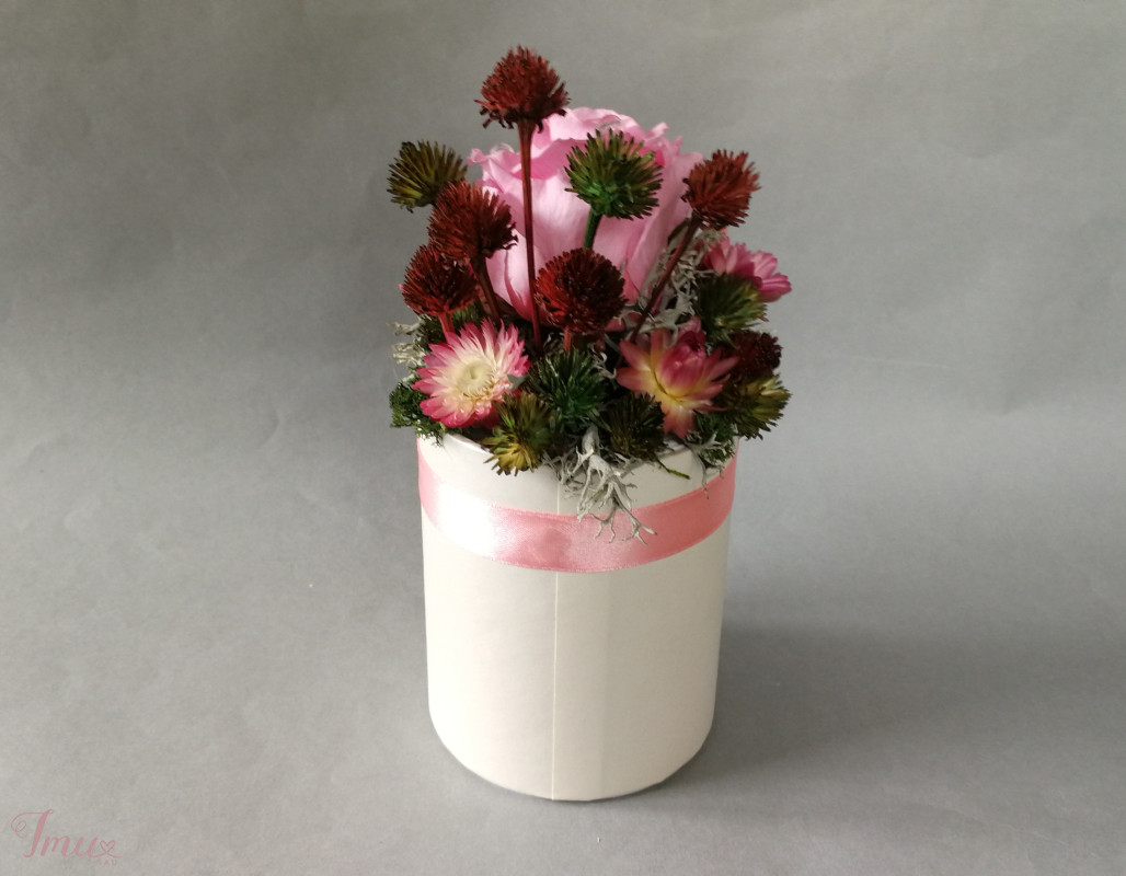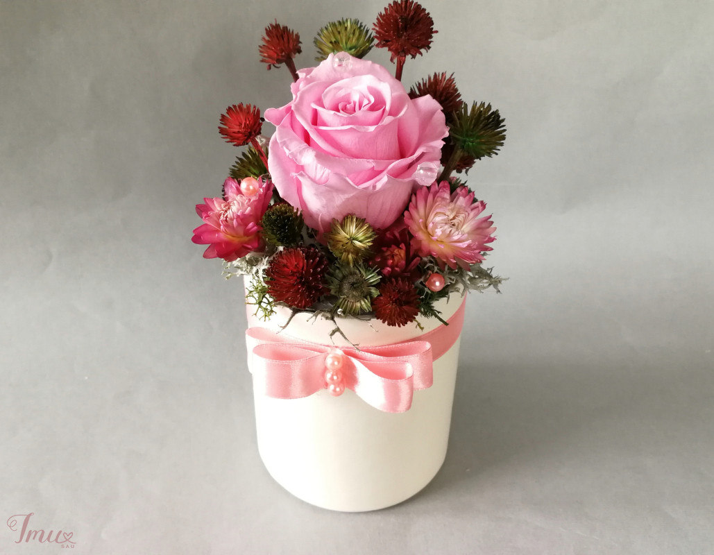 Mieganti rožė su sausuoliais ir stabilizuotom samanom, augalais. Dėžutė- pieno baltumo spalvos. Aukštis nuo stalo apie 18 cm, žiedyno skersmuo apie 10 cm, dėžudės dugno skersmuo 8 cm. Kaina 12 eur Ši kompozicija ilgai puoš namus (iki 3 metų). Nelaikykite saulėje ir drėgmėje. Dulkes atsargiai nupūskite su plaukų džiovintuvu. Visas pagamintas ir šiuo metu turimas kompozicijas rasite fb: https://www.facebook.com/geliudirbtuveles/shop/?view_public_for=1902406066516325&ref_code=mini_shop_profile_plus_shop_tab_cta&ref_surface=profile arba su mygtuku "pirkti" : Lietuviška prekė- https://www.lietuviskapreke.lt/parduotuves/dkfromlinen