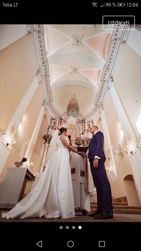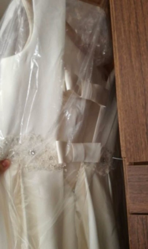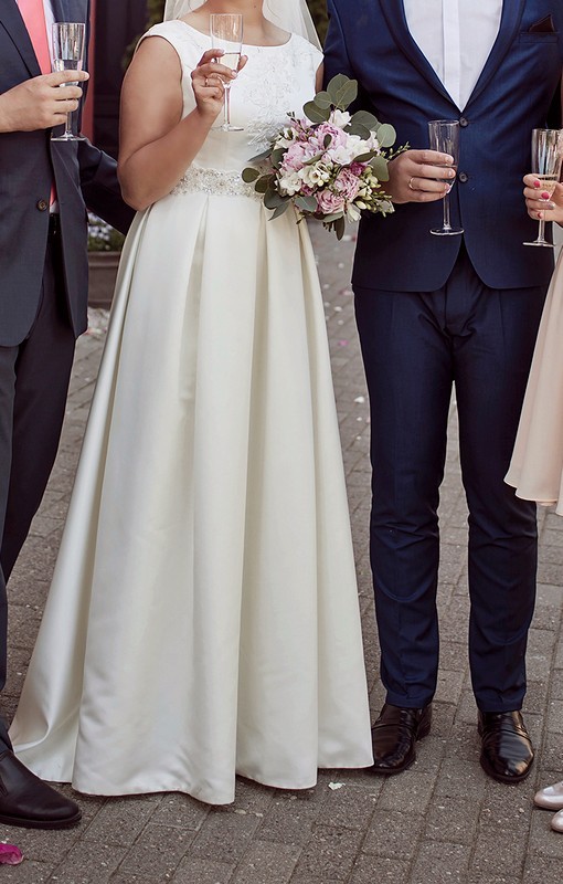 Minimaliai reguliuojamo dydžio vestuvinė suknelė. Atitinka 38-40 dydį, visa kita reguliuojasi. Krūtinė: 93 cm. Tiks būsimai nuotakai nuo 170 cm ūgio. Medžiaga: mikado šilkas. Nėriniai ir juosmens diržas siųti rankomis (ne klijuoti) Kaspinėlį galima persiųti (mažint-didint). Ties liemeniu apačioje po antru kaspinėliu yra paslėptas korsetas. Pasimatuoti galima Vilniuje.