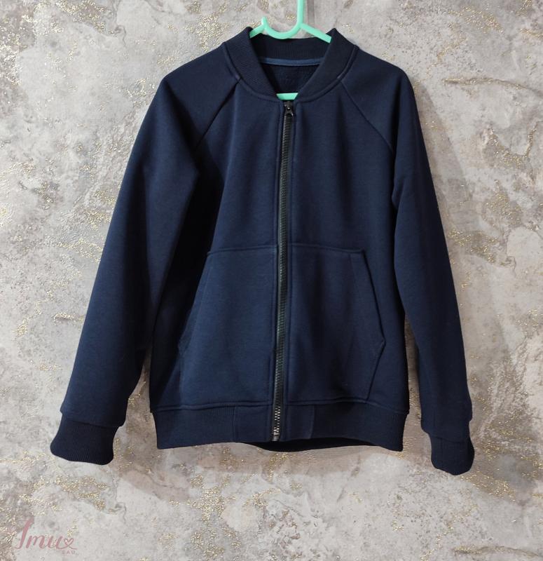 t.mėlynos spalvos bomperis. su užtrauktuku ir kišenėmis. Galimi dydžiai nuo 116 - 170 ūgio. Trisiūlis kilpinis trikotažas: 80 medvilnės 20 poliesterio.