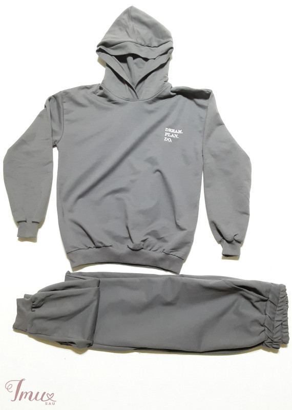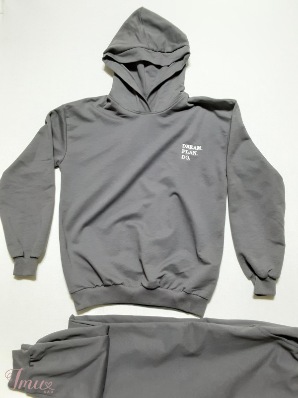 Naujas, medvilninis, kokybiškas laisvalaikio kostiumas. Spalvos: pilka. M dydis: džemperio krūtinės apimtis 52×2cm. Kelnių liemuo 35-45×2cm, klubai 52×2cm, ilgis 105cm.