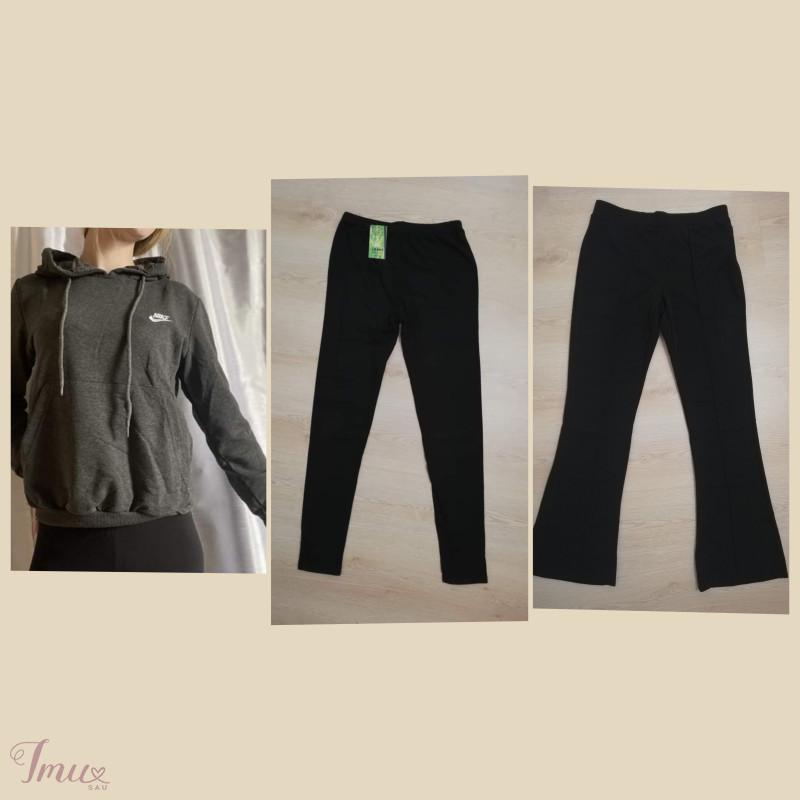 Moteriski nauji rūbeliai, parduodami visi kartu, urma sudaro džemperis, tamprės ir kelnės plačiomis apčiomis, dydis kelnių ir džemperio M, tamprių dydis M/L
