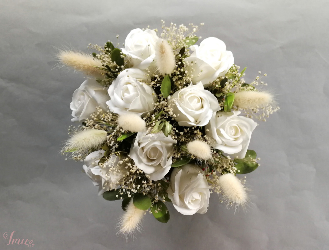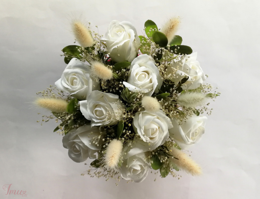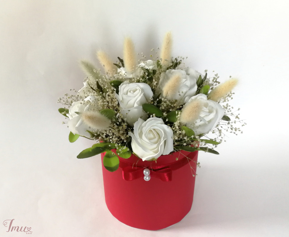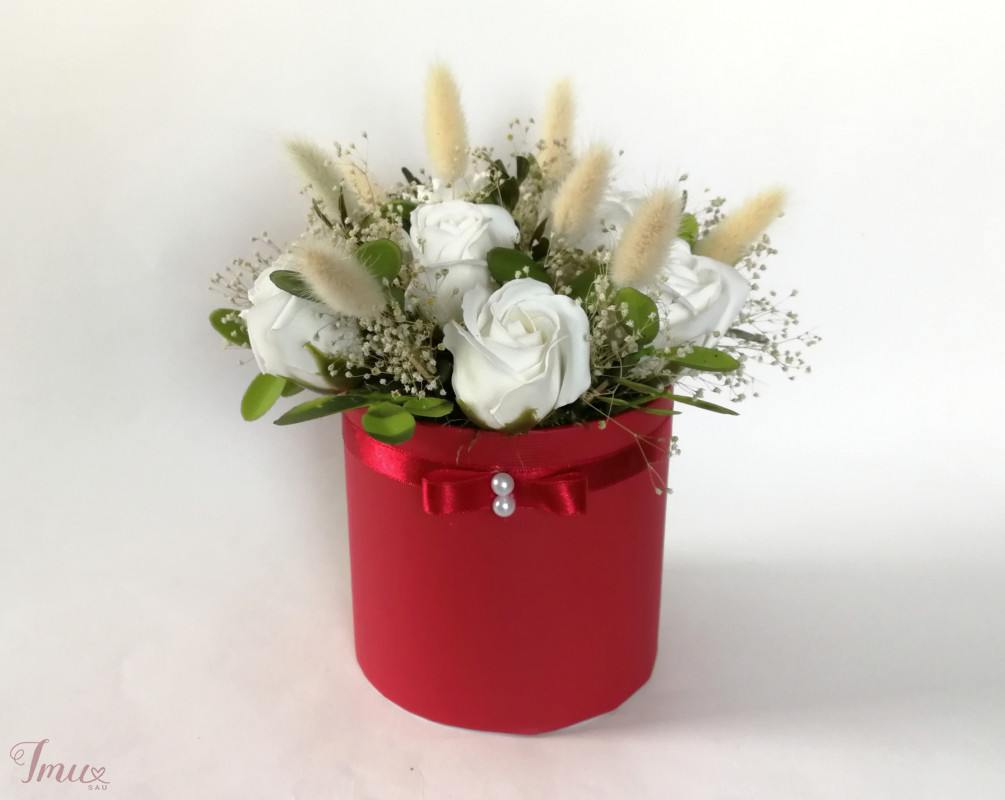 Devynios baltos plono muilo rožės, sausuoliai. Aukštis nuo stalo apie 23 cm, žiedyno skersmuo apie 21 cm. Kaina 16 eur. Visas pagamintas ir šiuo metu turimas kompozicijas rasite fb: https://www.facebook.com/geliudirbtuveles/shop/?view_public_for=1902406066516325&ref_code=mini_shop_profile_plus_shop_tab_cta&ref_surface=profile arba su mygtuku "pirkti" : Lietuviška prekė- https://www.lietuviskapreke.lt/parduotuves/dkfromlinen