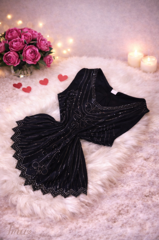 Juodas, figūrą pabrėžiantis topas, puoštas žėrinčiais kristalais, spindinčiais kiekviename žingsnyje. Įkvėptas art deco stiliaus, jis subtiliai derina prabangą ir rafinuotumą. Tobulas pasirinkimas vakarui, šventei ar išskirtinei fotosesijai.