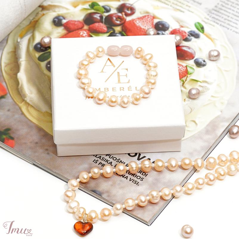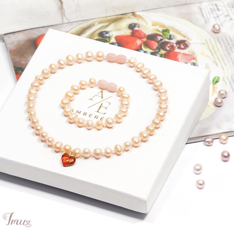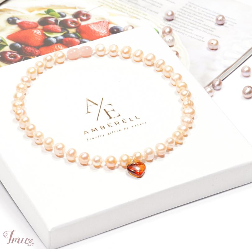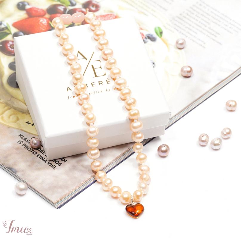 Natūralių gėlavandenių perlų komplektas su natūralaus Baltijos gintaro širdele