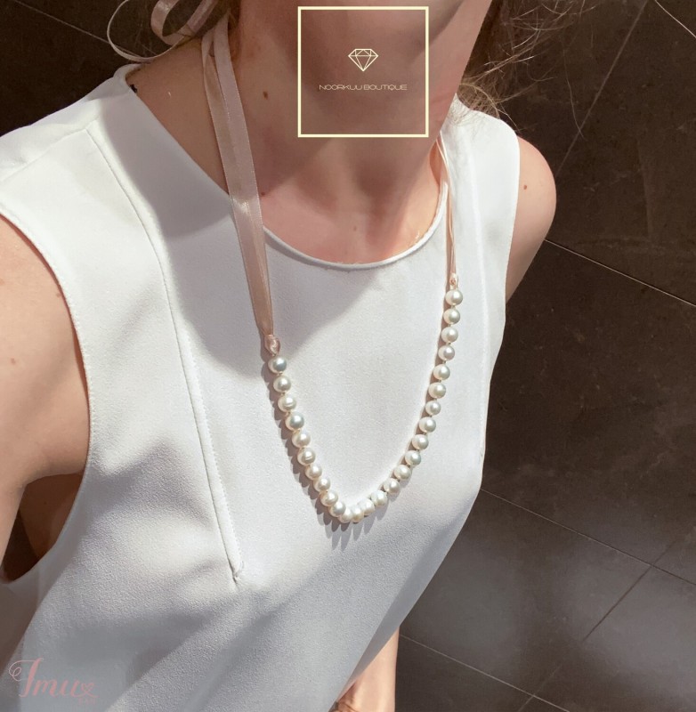 Natūralių upinių perlų vėrinys su juostele. Ilgis reguliuojamas nuo 40 iki 90 cm Perlo skersmuo: 9 mm Prekė supakuota į baltos spalvos, gražią, puošnią dėžutę. Prekes išsiunčiame per 1 d.d. nuo apmokėjimo. Brendas Noorkuu boutique